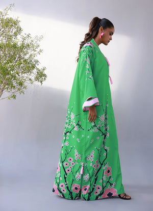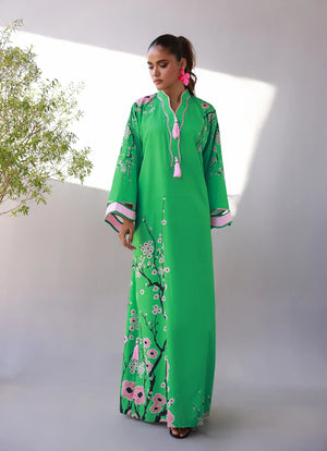 A Stroll in Greenwoods kaftan is a dreamy green wonder with pops of pink florals that feel straight out of a storybook. The wavy cut neckline with tassel and scalloped sleeves add a playful, stylish twist, making it perfect for twirling through your day in comfort and charm. Soft, breathable crepe makes it easy to wear, while the pretty color palette and sweet details make this kaftan a total eye-catcher.