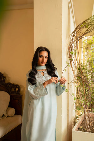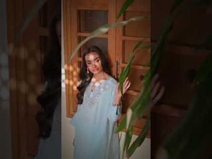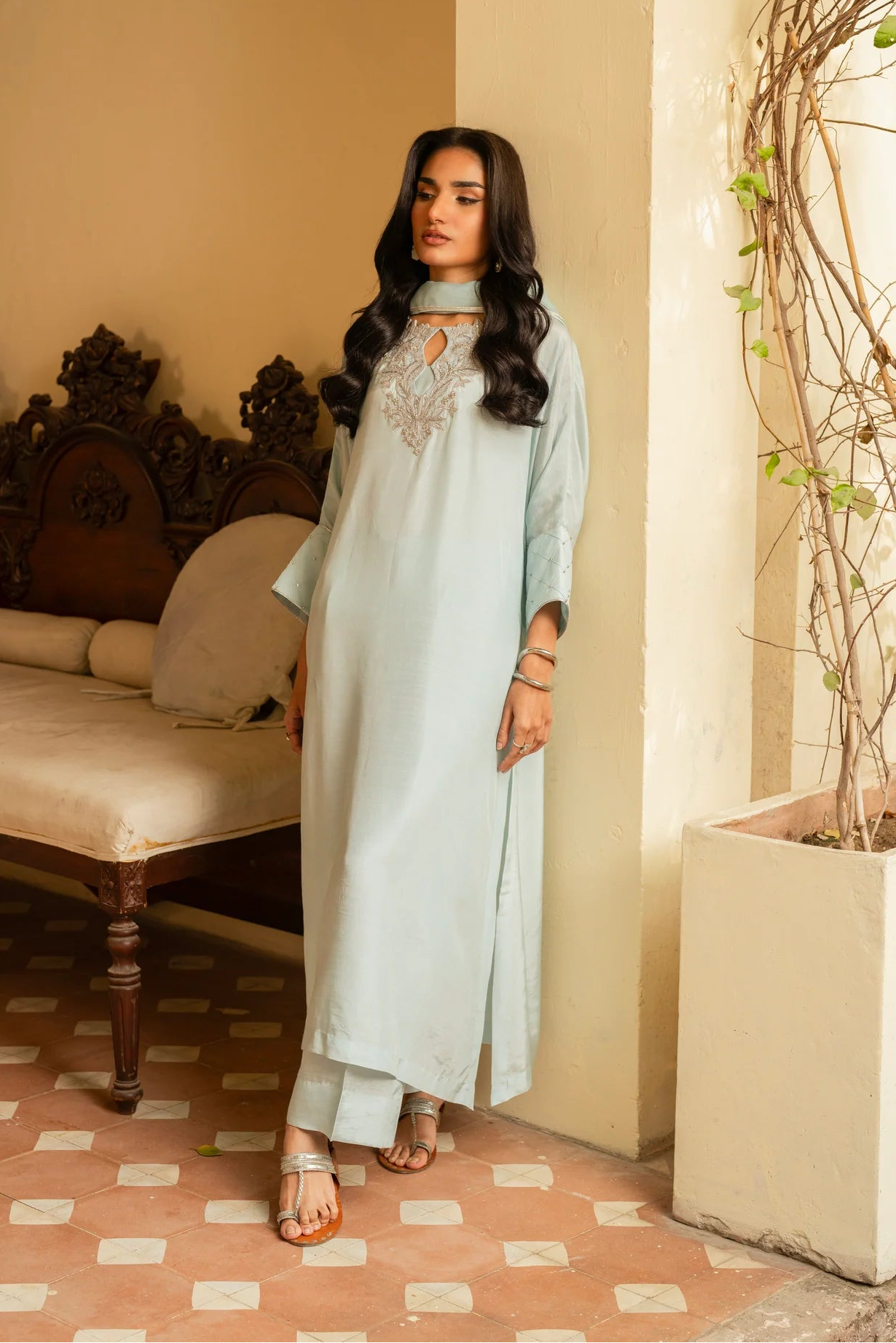 Refresh your everyday wardrobe with this ice blue raw silk outfit, crafted for comfort and effortless style. The baggy, loose-fit shirt features an ethnic cut-line neckline, creating a contemporary yet traditional silhouette. Pintuck details and subtle adda work on the sleeves add texture and handcrafted charm, elevating the overall look.Paired with a standard raw silk trouser, this ensemble is perfect for casual outings, workdays, or relaxed festive occasions.