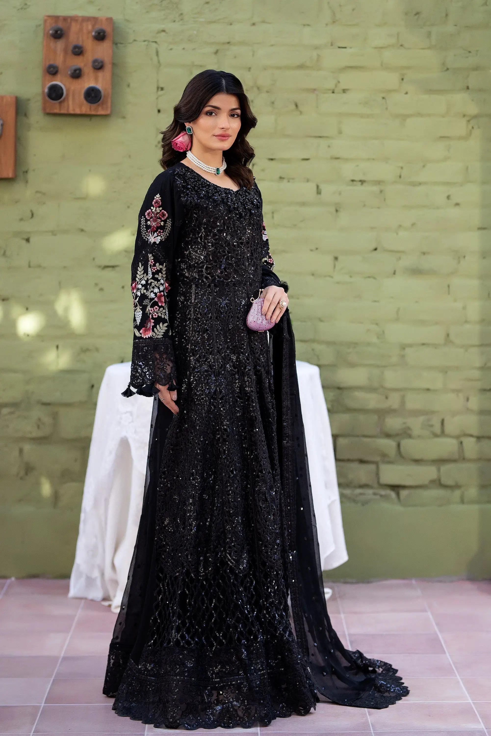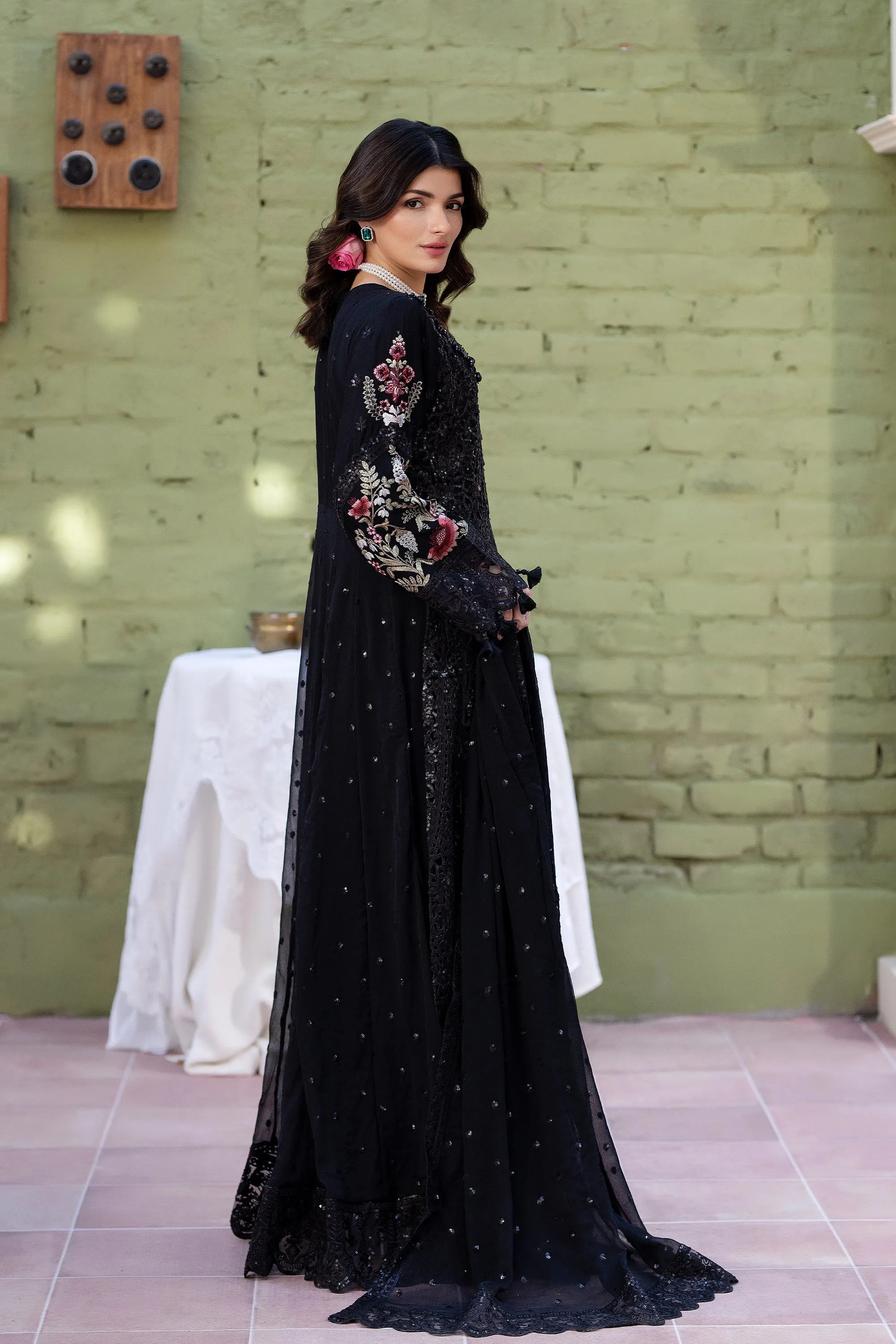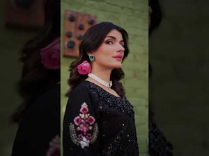 A stunning black maxi showcasing intricate laser cutwork with delicate adda detailing along the neckline. Embroidered organza borders enhance the hem and sleeves, complemented by embroidered chiffon sleeves and back. Paired with straight raw silk trousers for an effortlessly elegant look.