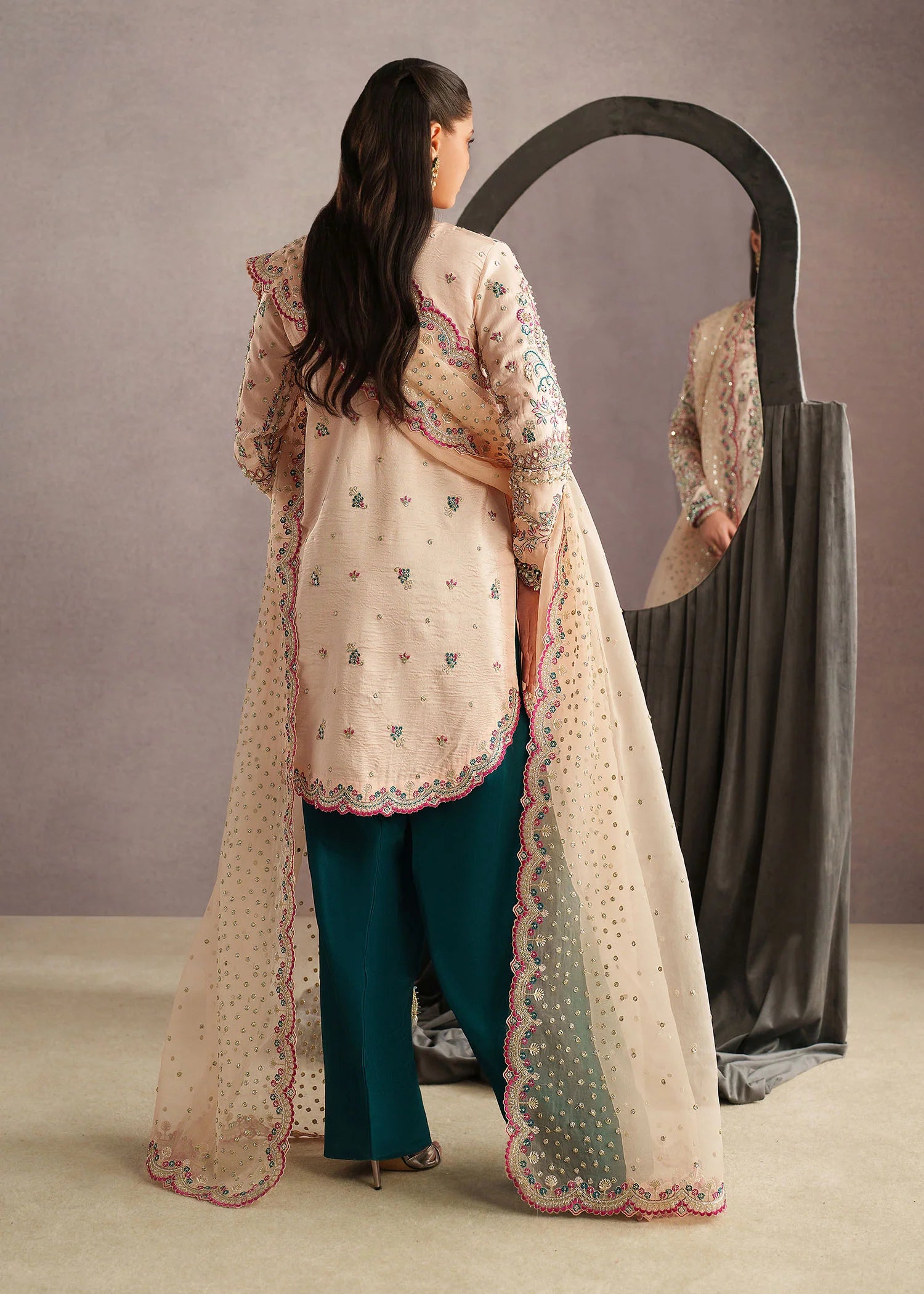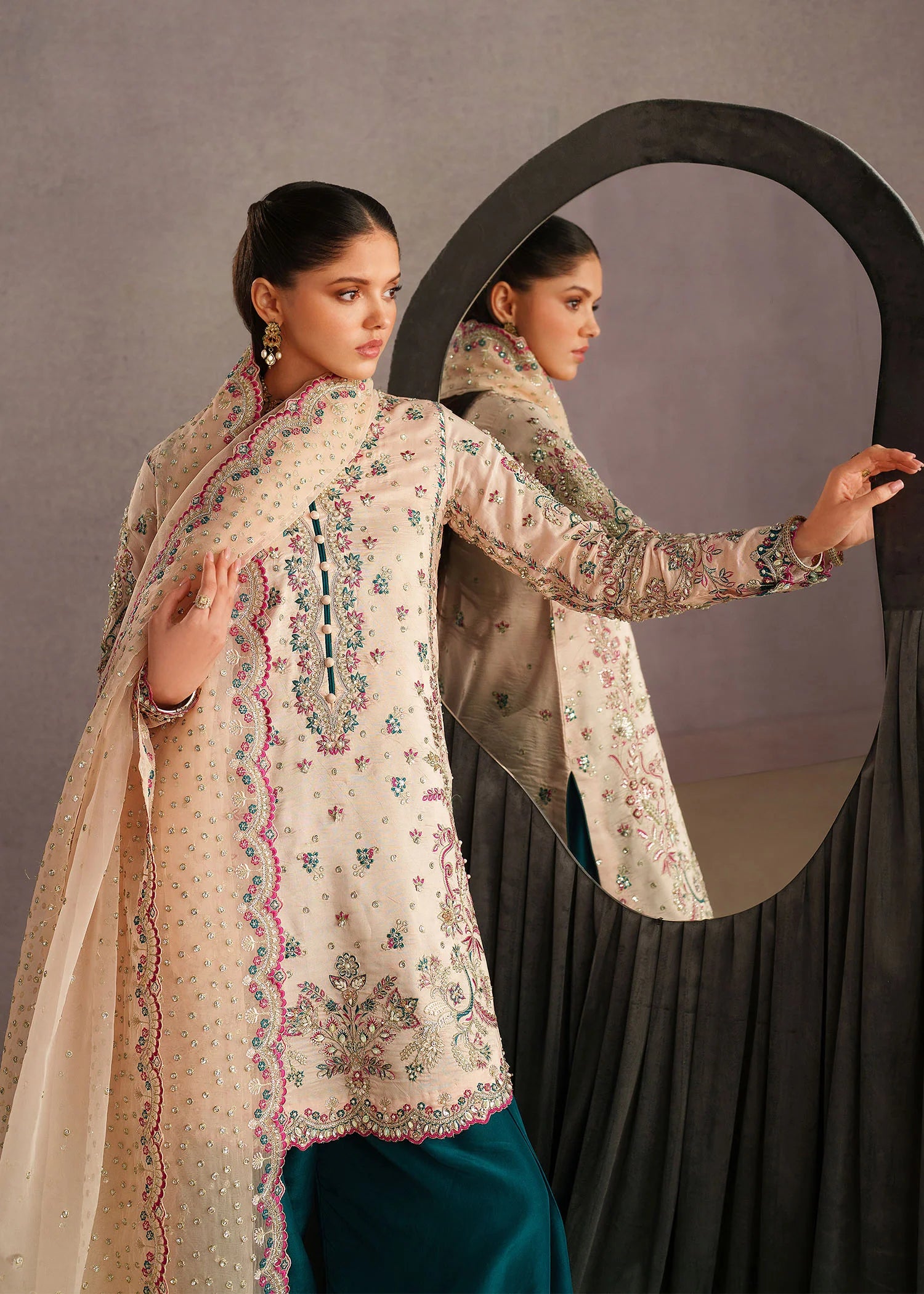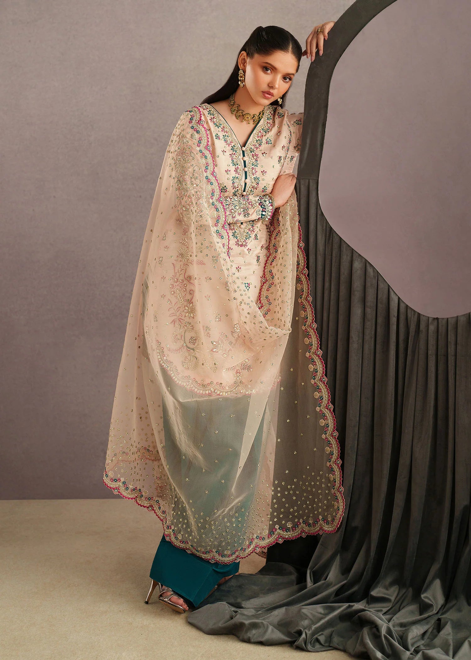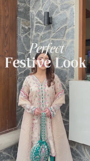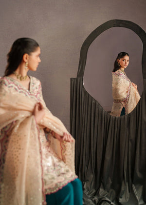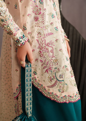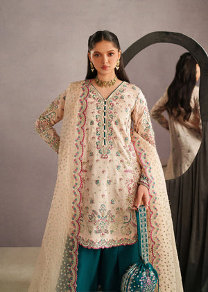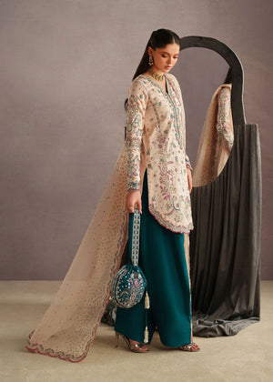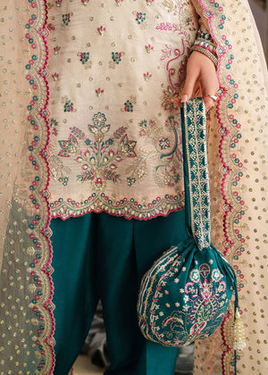 An elegant three-piece traditional outfit featuring a soft ivory embroidered kameez adorned with delicate floral motifs and intricate detailing along the neckline and hem. The kameez is paired with rich teal straight-cut trousers that add a striking contrast to the subtle base tone. Completing the look is a sheer ivory dupatta, beautifully finished with scalloped embroidered borders and scattered embellishments for a graceful drape. The ensemble is styled with minimal gold jewelry and a matching teal potli bag, creating a refined and timeless look perfect for festive  Eid occasions or formal gatherings.