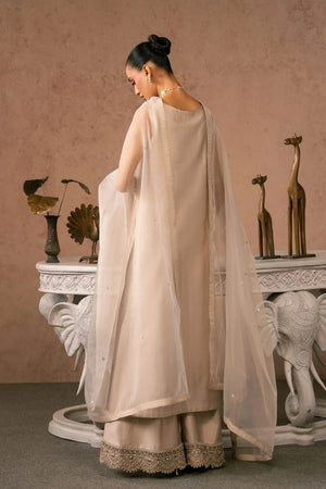 A sheer organza dupatta completes the ensemble, lightly scattered with subtle accents and draped effortlessly over the shoulder for an ethereal finish.