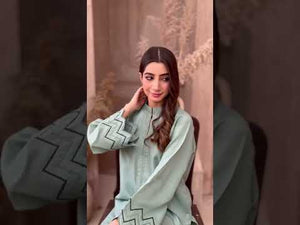 Apple green matching set includes a long shirt with embroidered details on sleeves along with straight trouser.