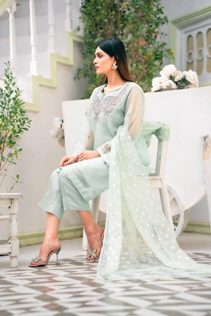 - Indulge in the allure of “Levander Dream,” a three-piece marvel marrying classic sophistication with modern elegance. With delicate piping throughout, this ensemble adorns itself in mashed Gotti 3D embellishments and double-shaded Tilla work. The organza dupatta, embellished with fancy Broshia and lace, adds an ethereal touch to this dreamy attire, crafted from exquisite fabrics like organza, cotton silk, and viscose silk. Standing at 38 inches, our model brings this enchanting vision to life, inviting you into a world where glamour meets fantasy.