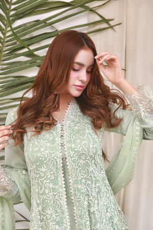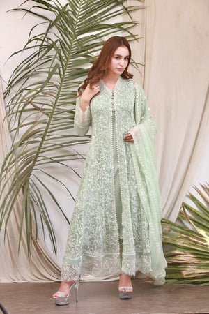 - Step out in style with our latest front open shirt coupled with separate chiffon inner. The embroidery is crafted with resham, lace which is giving an elegant touch to this gorgeous outfit. This sophisticated shirt is paired with a narrow crepe pant.The design serves as the ultimate look to make a classic entrance in formal gatherings.
