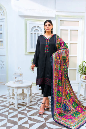 - “Arabian Night” sets the stage for an enchanting narrative merging classic finesse with contemporary allure. This ethereal three-piece ensemble, crafted in fine silk, shimmers with multi-shade thread work that weaves a tale of timeless elegance. The shirt, adorned with intricate piping, exudes sophistication and grace, invoking the magic of an Arabian night.The silk dupatta, a canvas of artistry, showcases captivating multi-shade printing and intricate mirror embellishments, crafted by skilled Pakistani artisans. A testament to exquisite craftsmanship, this ensemble enchants with its dreamy silhouette, featuring a straight trouser or capri, adding a touch of modernity and whimsy.(The model wears a size Small, gracing the night with allure at a length of 40 inches.)