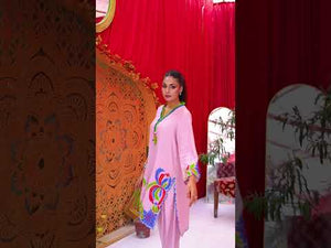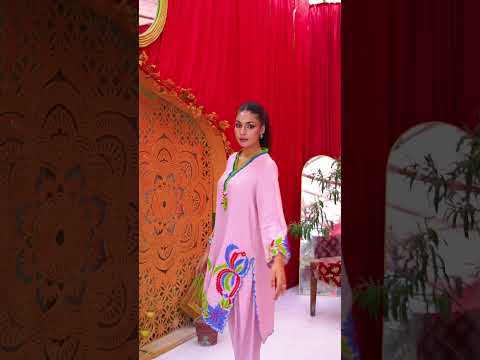 a beautifully designed two-piece ready-to-wear outfit crafted from soft viscose silk. The tea pink base is enhanced with intricate machine embroidery and delicate appliqué work in teal blue, neon, and deep red tones. Featuring a short-cut shirt paired with a matching shalwar, Arisha blends modern style with effortless comfort.