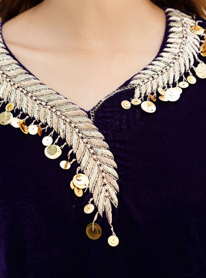 This winter season, shimmer in this ethereal purple velvet shirt with asymmetrical handwork along the neckline. Pair with matching purple pants creating a radiant look.