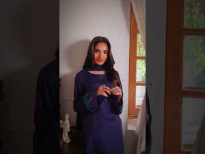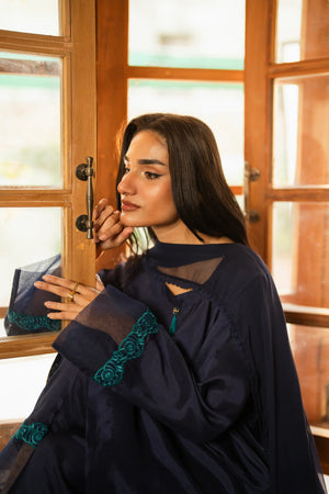 Statement with this navy raw silk ensemble, designed for effortless sophistication. The shirt features contrasting embroidery on the sleeves, adding a chic, contemporary edge, while the trouser bottom mirrors the intricate detailing for a coordinated, fashion-forward lookStyle it with the optional chiffon dupatta for a touch of grace, or go minimal for a sleek, modern vibe. Perfect for festive gatherings, semi-formal events, or everyday ethnic elegance.