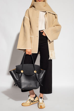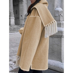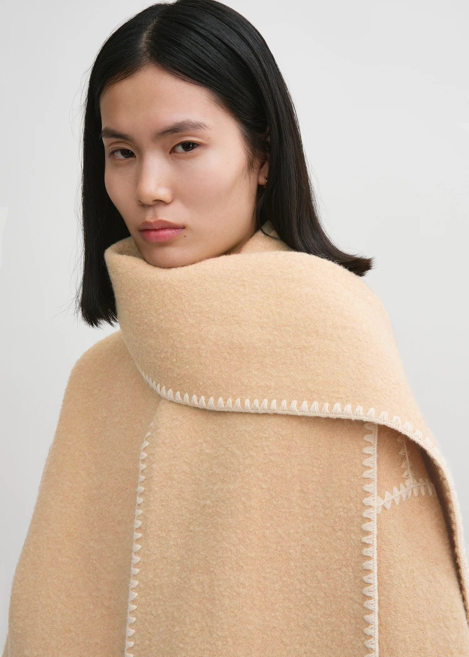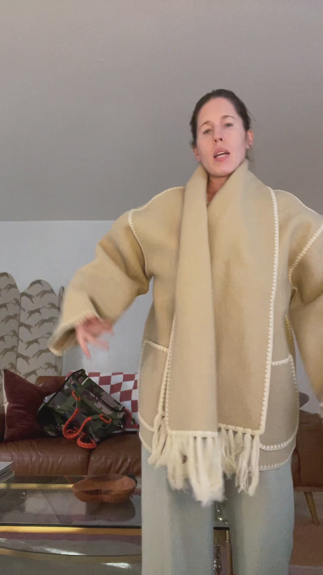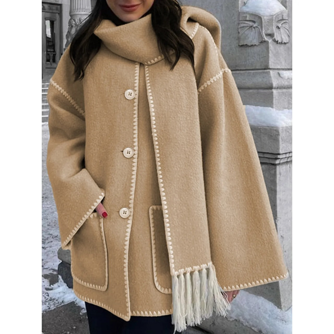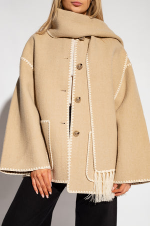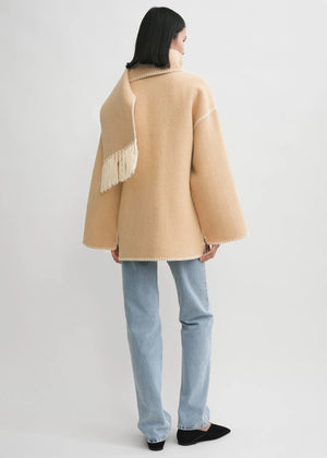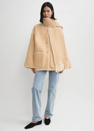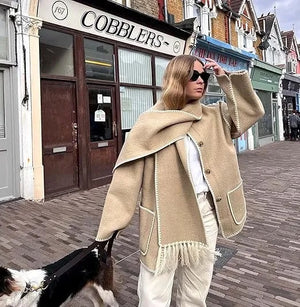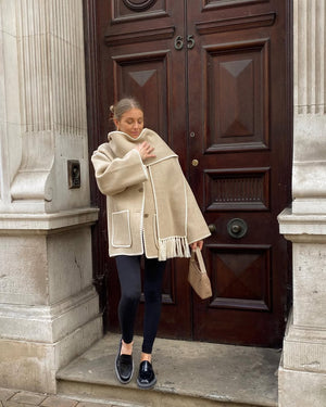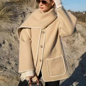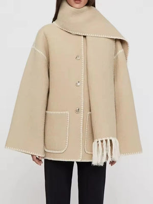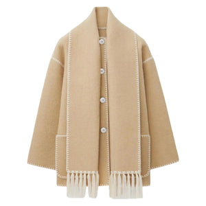 The Aurea Scarf Coat is a luxurious blend of modern design and timeless elegance, crafted from premium woven wool. Featuring a unique detail, wide sleeves, and an oversized silhouette, this coat offers both style and functionality. Its intricate whipstitch detailing along the edges adds a touch of sophistication, while the soft wool fabric ensures warmth and comfort throughout the colder months. Perfect for layering over casual or formal outfits, the Aurea Scarf Coat redefines effortless chic for any occasion.