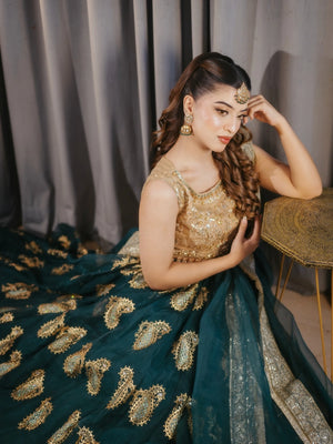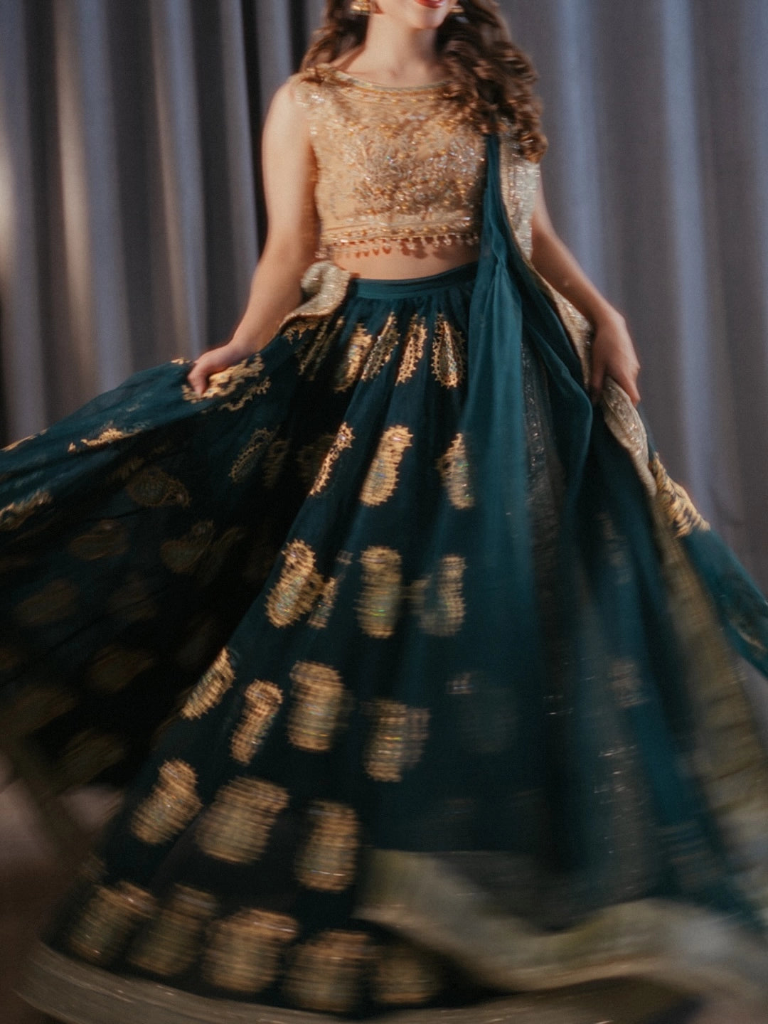 Illuminate your festive celebrations with Aurelia. This breathtaking bottle green lehenga is paired with a delicate net blouse and an organza dupatta, all adorned with luxurious embroidery and foil prints. With its intricate craftsmanship, Aurelia promises to capture timeless beauty and elegance at every event