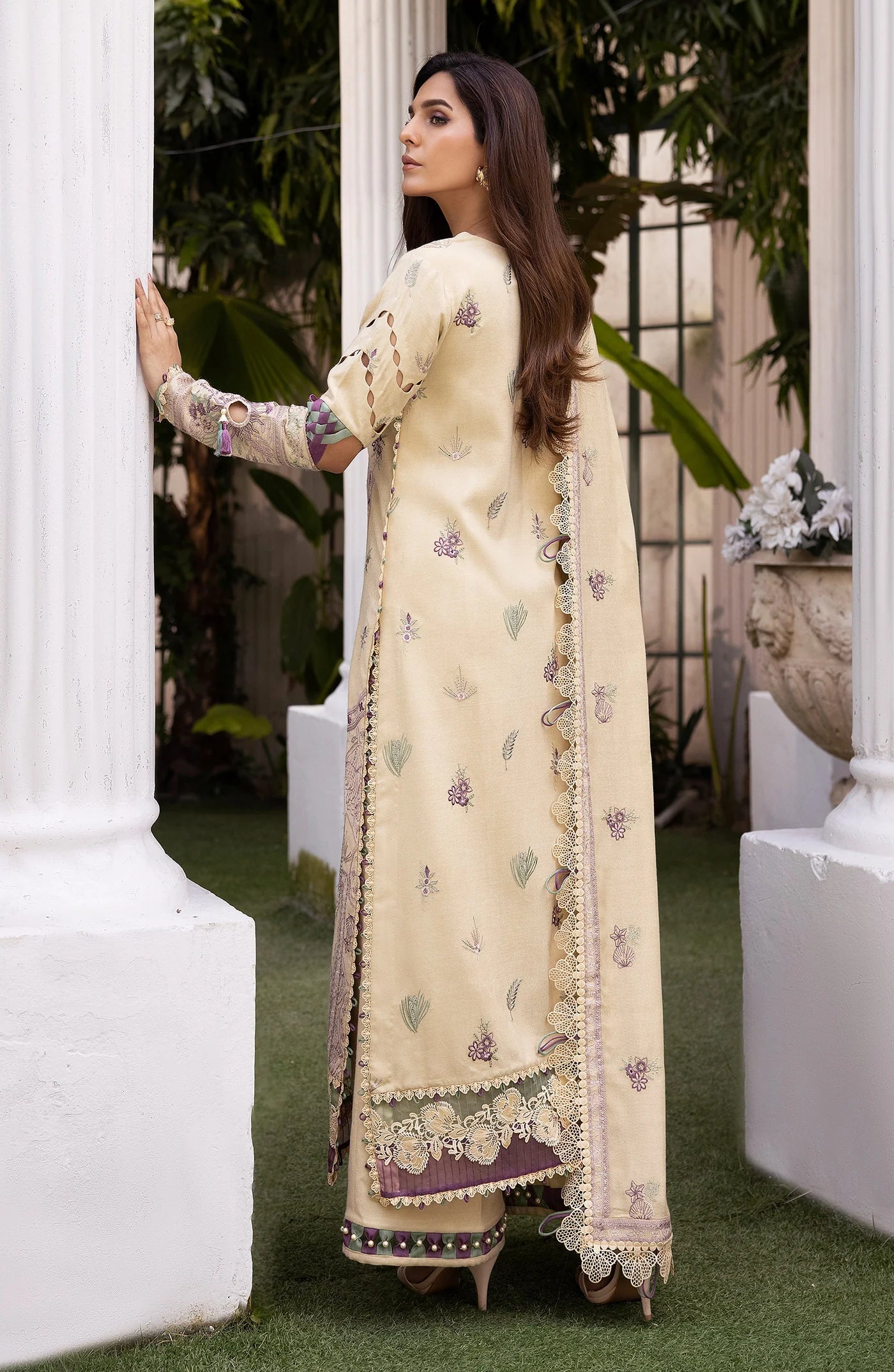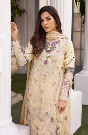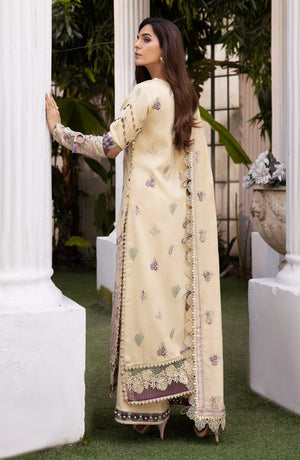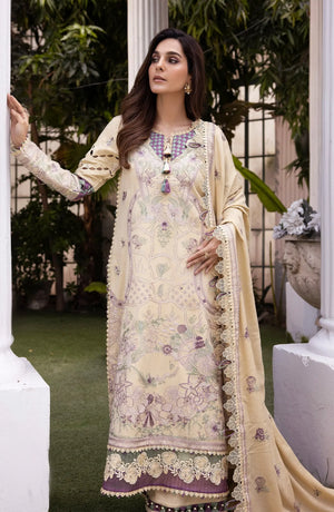 This elegant three-piece outfit is perfect for any formal or semi-formal occasion. It features a delicate cream and lavender-toned embroidered lawn kameez with intricate floral and geometric patterns. The neckline is adorned with tassels and decorative embellishments, adding a sophisticated touch. The sleeves are detailed with embroidery, enhancing the overall charm. The hem of the shirt showcases intricate lacework with a beautiful border.