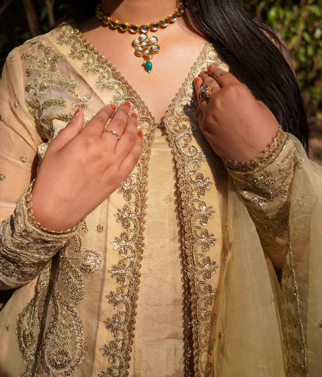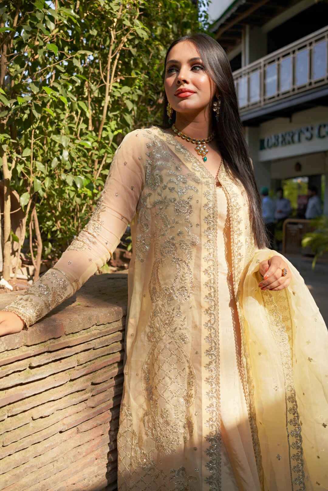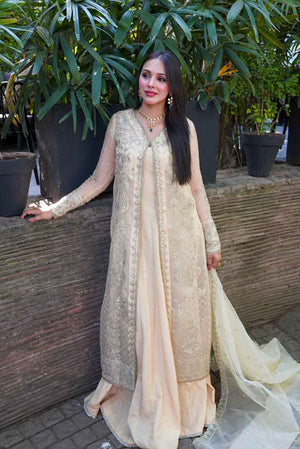 Additional Description: Organza Embroidered sequin work jacket Left,Right and extend Panel, Organza Embroidered back, Organza Embroidered Sleeves and border, Organza Shirtborders. Organza Embroidered dupatta with 4 side border and 4 corners, Rawsilk Lehng/Maxi.
