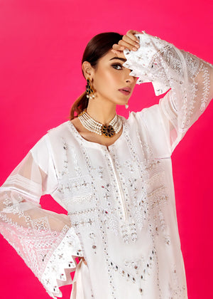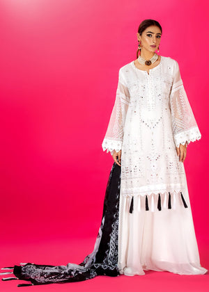 Organza printed dupatta with organza embroidered shirt handwork with crystals and pearls over it plain grip trouser finishing with lace and tussles. Disclaimer: Dry clean only.