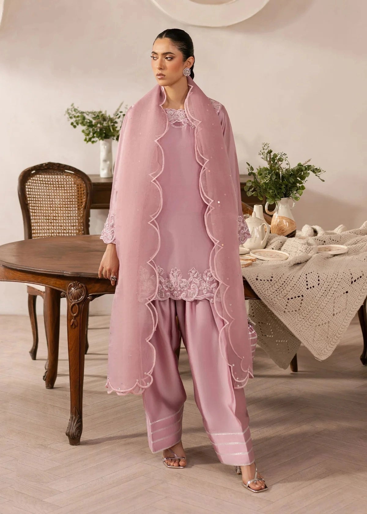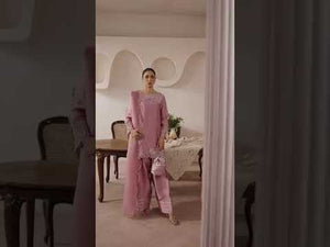 A vision in soft lilac, this ensemble is crafted from luminous tissue silk for both shirt and trouser, offering a fluid drape and subtle sheen. Finished with a diaphanous organza dupatta, delicate embellishments elevate the look for Eid and summer soirées. Effortless elegance for the woman who cherishes refined simplicity.