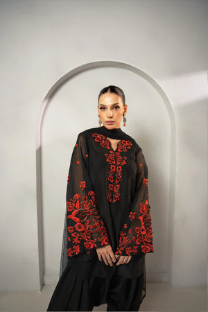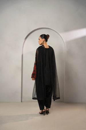 Make a bold and graceful statement with this stunning 3-piece ensemble in rich black and rust orange, crafted from luxurious sheesha silk. The embellished shirt is intricately designed with fine detailing that adds a subtle shimmer and texture to the fabric, while the black Patiala shalwar brings a touch of traditional flair and vibrant contrast to the outfit.