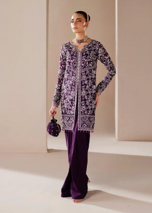 Description:   Deep enchanting purple that feels like dusk captured in fabric. It draws you in quietly, then holds you there. Aysel mirrors that allure with its front-open short shirt and fluid draped skirt, brought to life through intricate hand embellishments of crystals, pearls, Swarovski, and fine stones. Every detail is placed with intention, creating a soft shimmer that moves with grace. It’s elegance without effort the kind that speaks softly, but stays with you!