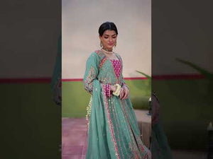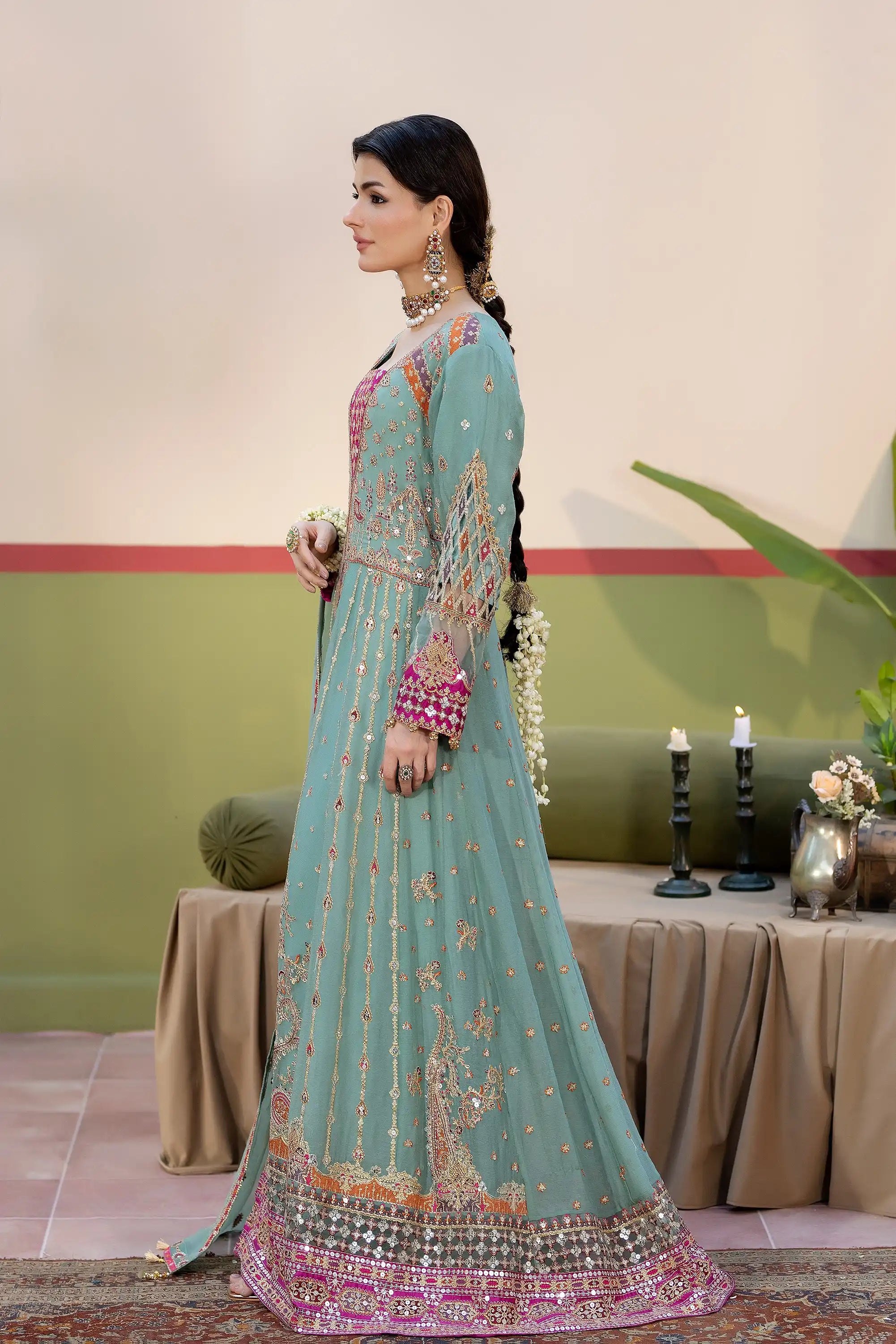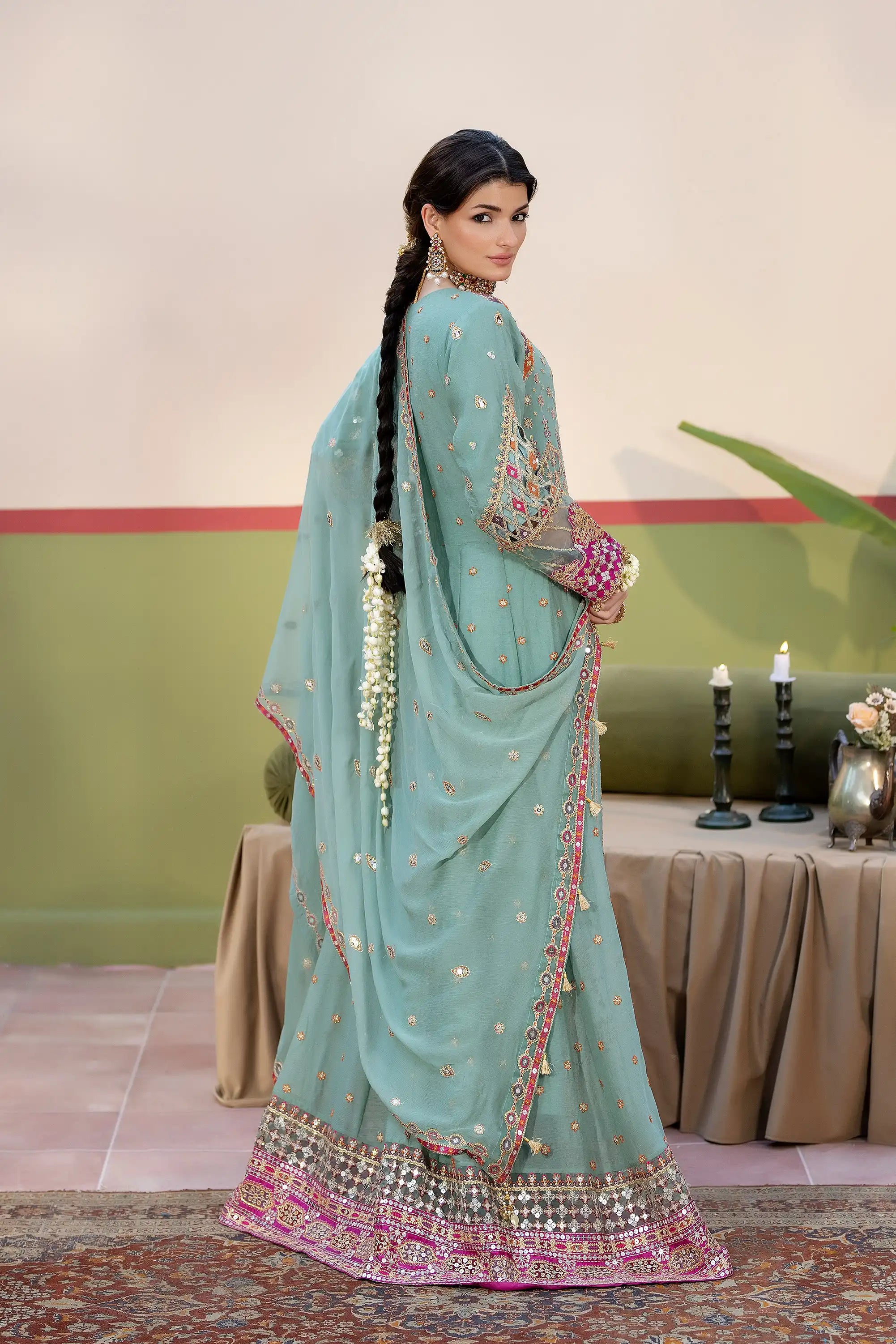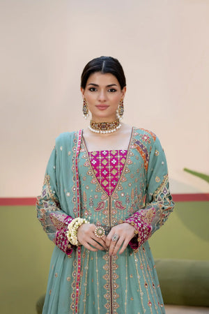 Chiffon grace redefined — a straight-cut embroidered maxi adorned with intricate detailing and silk borders. Paired with a beautifully embroidered chiffon dupatta and a raw silk trouser for a refined, timeless look.