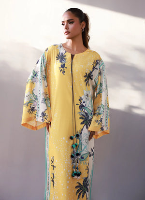 Beneath the Sunlit Trees kaftan is a quirky everyday essential, crafted in soft, breathable crepe for ultimate comfort. Its vibrant yellow base is playfully printed with blue trees, while the neckline is finished with a tassel dori detail for that effortless boho-chic vibe. Fun, stylish, and easy to wear it’s the perfect piece to brighten up your everyday look.
