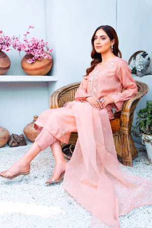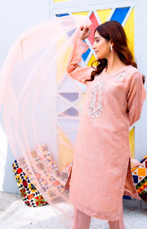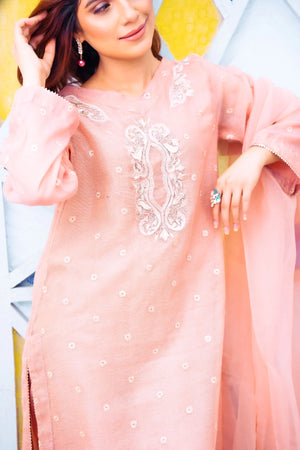 - Introducing our stunning Peachy Pink Cotton Net Dress, a perfect blend of traditional and modern fashion. This elegant dress is sure to turn heads with its intricate embellishment and sequence work, meticulously crafted by our skilled artisans. The dress features a round neckline and straight-fitted sleeves that add a touch of sophistication and grace, while the soft peachy pink colour gives it a modern and refreshing feel.This Peachy Pink Cotton Net Dress is a perfect choice for any formal event or wedding, and is sure to make you feel confident and beautiful. Don’t miss out on this stunning piece, which is perfect for the fashion-conscious. Order it today and add a touch of elegance and glamour in the wardrobe!