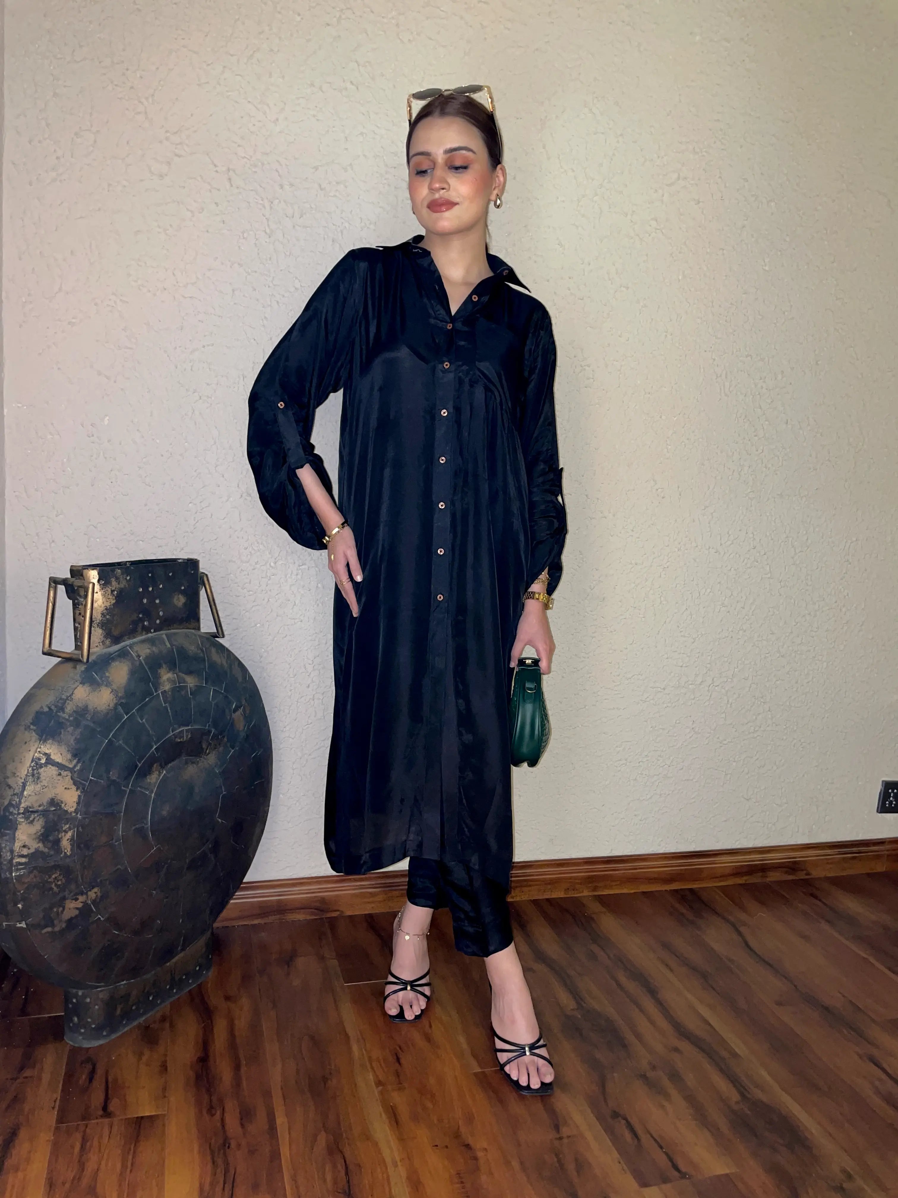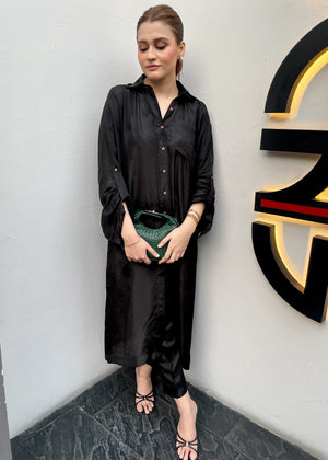 A timeless 2-piece solid outfit in classic black, tailored on luxurious tussel silk. Featuring a sleek collared shirt paired with straight trousers, this set embodies minimal sophistication — a versatile wardrobe essential for day or night.