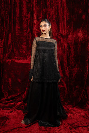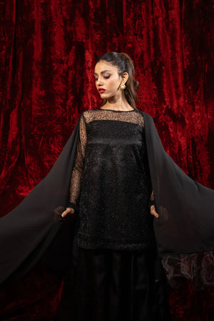 Introducing our exquisite cutdana embroidered net shirt paired with a luxurious shimmer satin dhaka pajama and a chiffon dupatta adorned with organza frill.