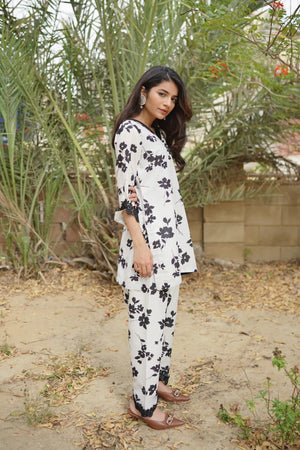 The shirt features unique tulip-cut sleeves and hem, with delicate lace detailing along the edges. A single button at the neckline adds a polished touch. Paired with trousers that mirror the tulip-cut design, this set offers a cohesive and stylish look.