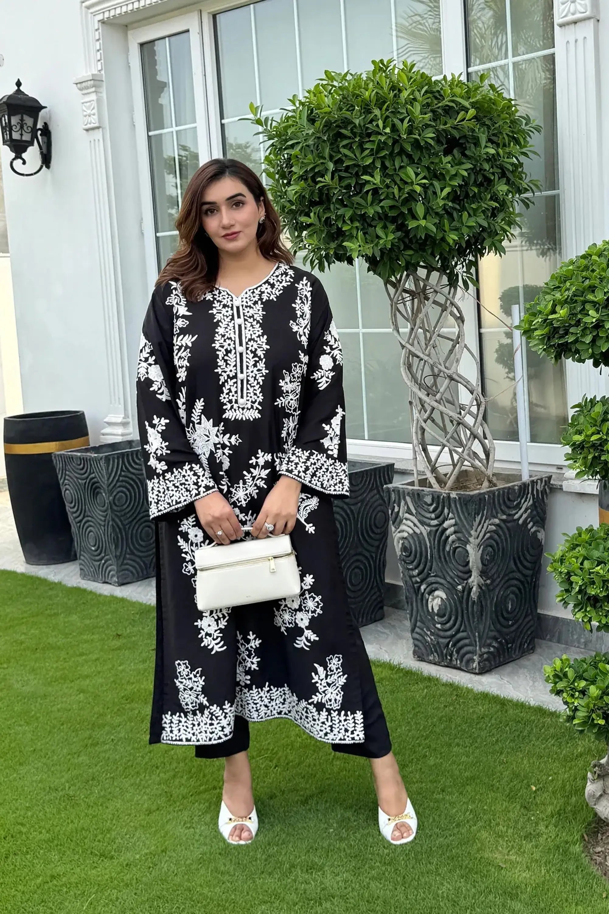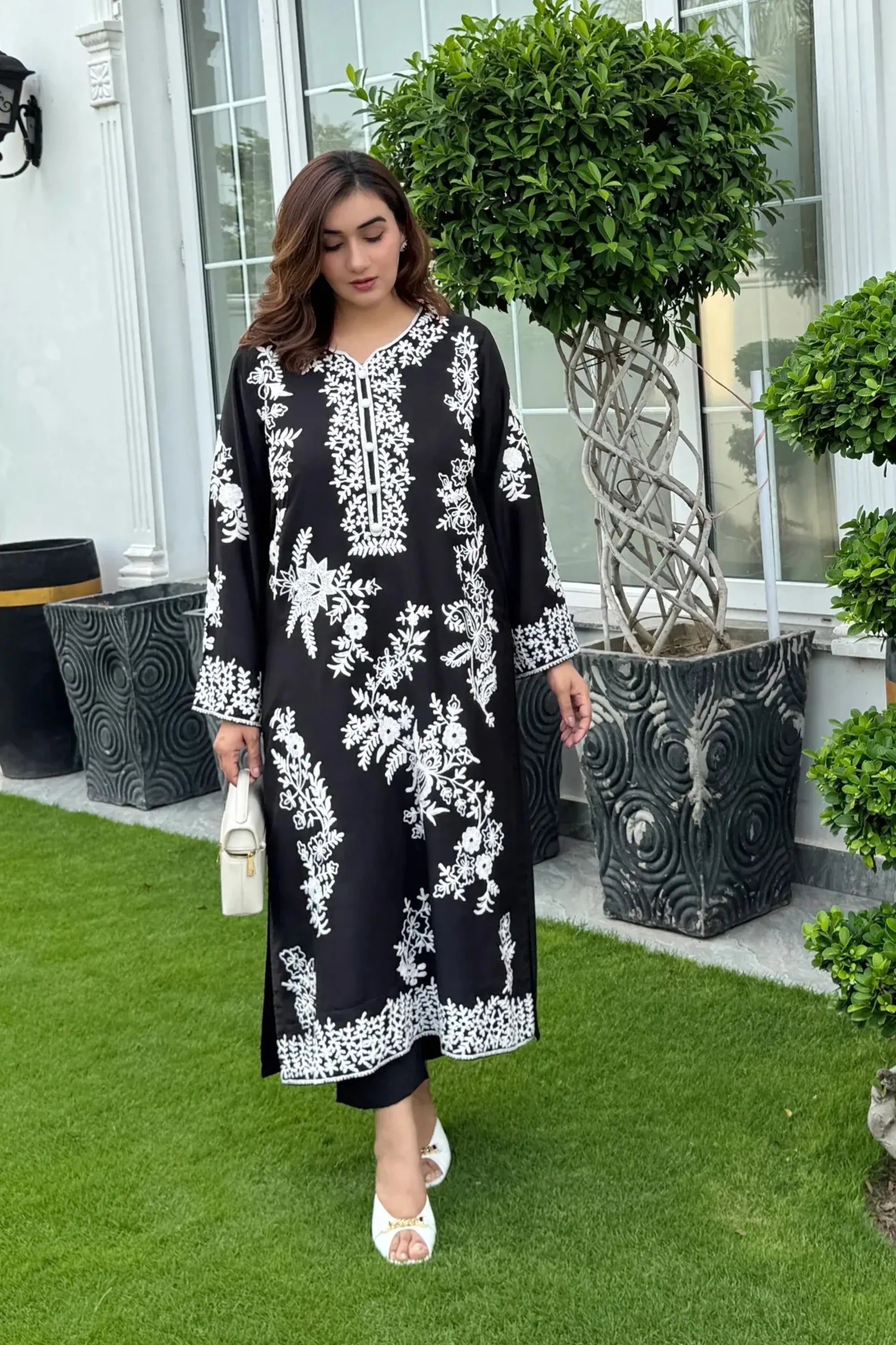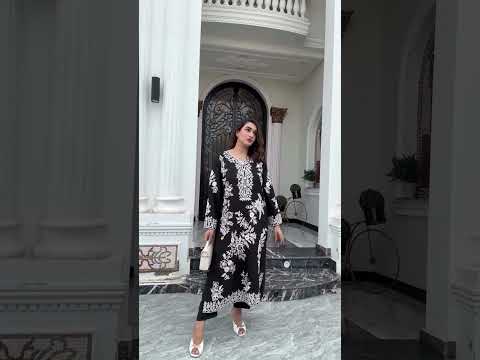 Beautiful fusion of colour, embroidery on long shirt with plain pants