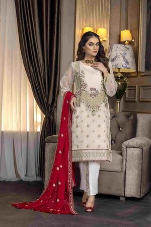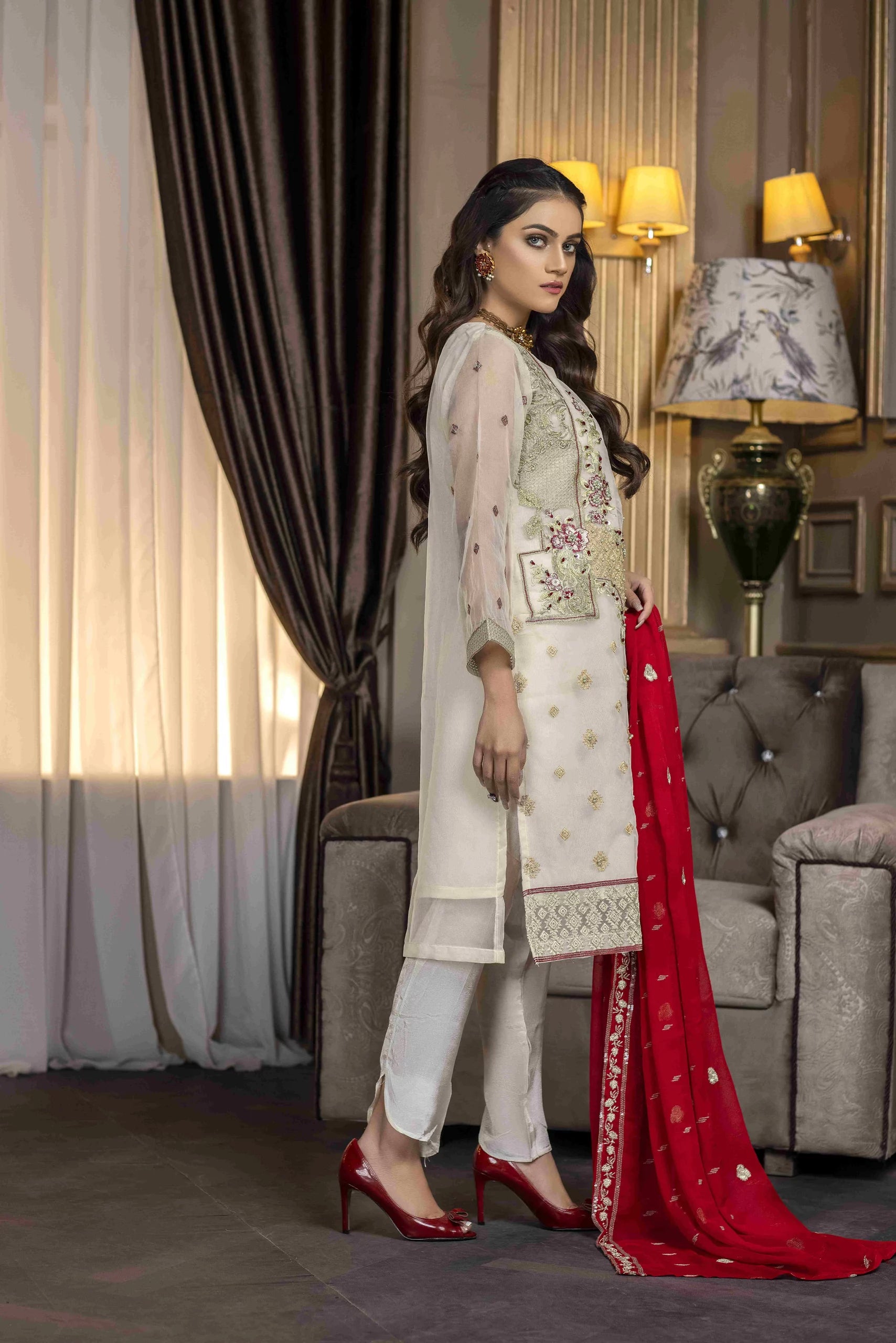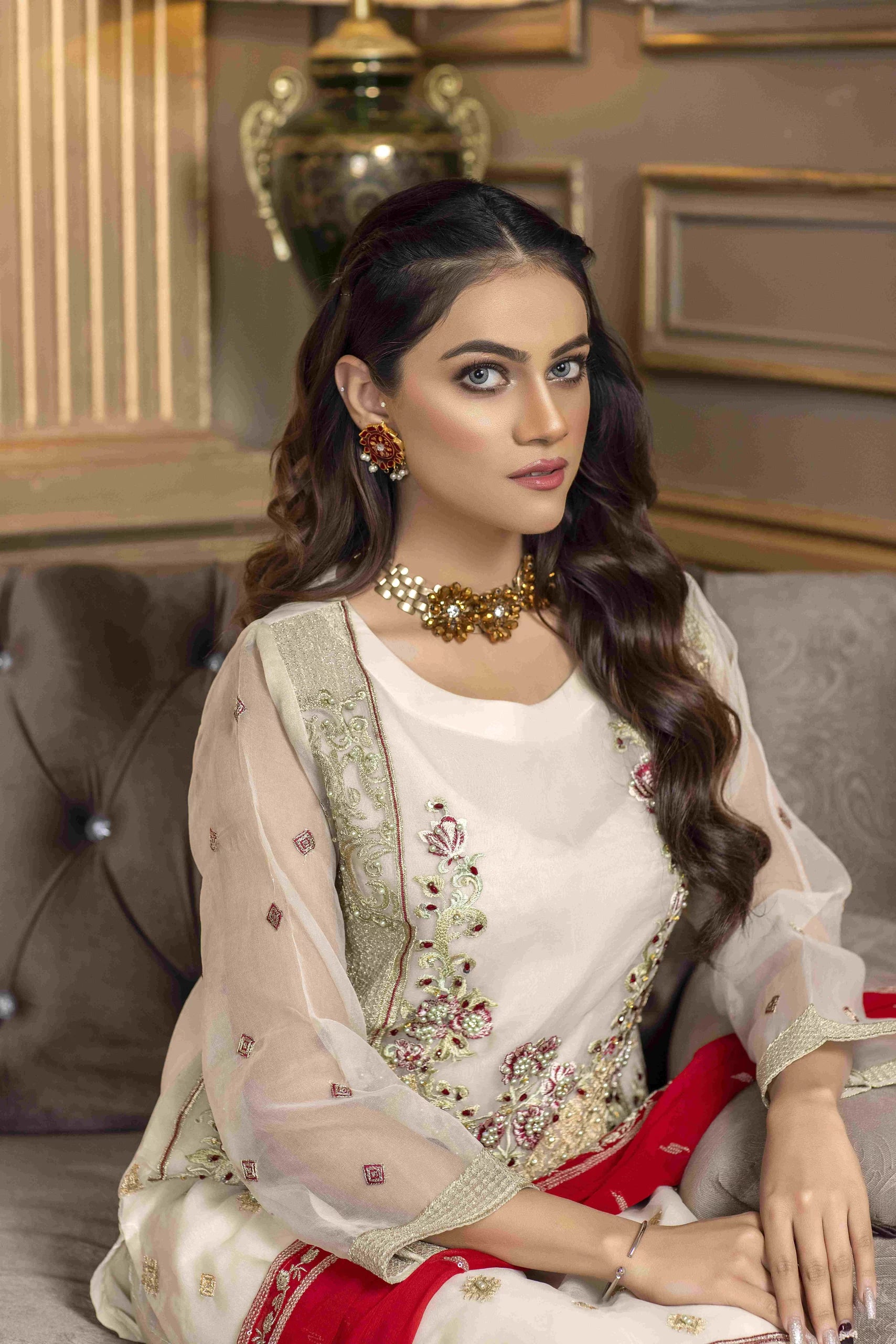 Delicately crafted hand-embroidered organza shirt in pearl white color is the ideal pick for evening events. Embroidery is done with dull gold and a hint of red makes an exquisite front. The border is moderately broad with the same Resham embroidery. Plain back is also available in organza fabric. The chiffon red rose dupatta pours life into this decent pearl white luxury pret wear. The trouser comes in Russian grip fabric in the same white color.