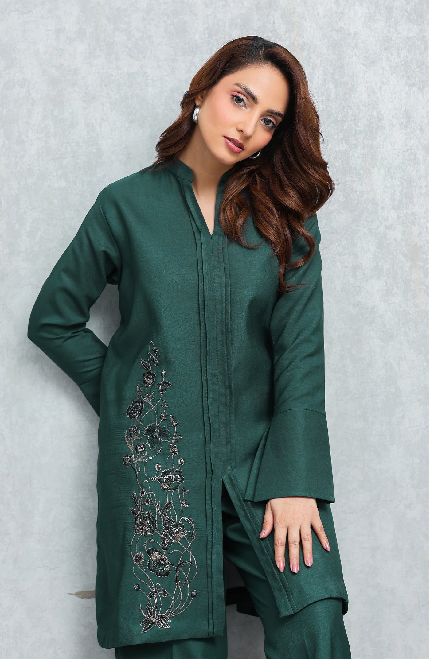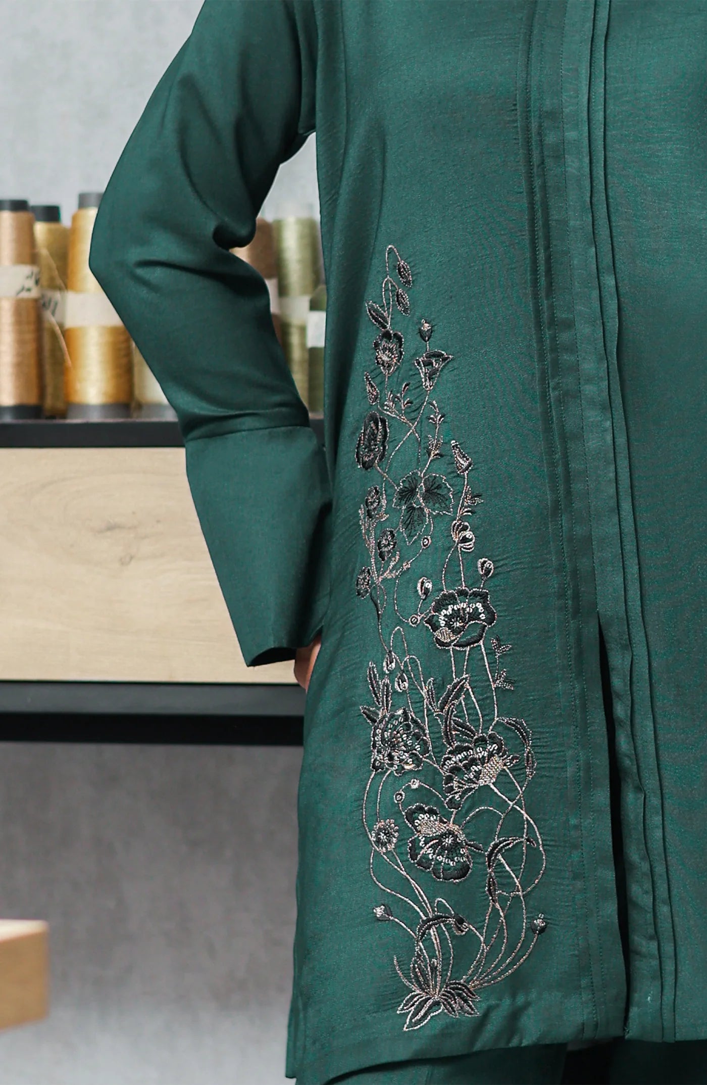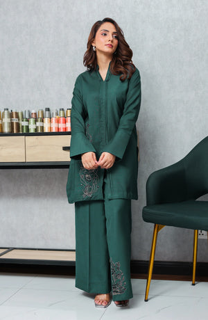 Crafted from premium fabric, the bottle green shirt features exquisite stitching details and unique embroidery that add a touch of refined artistry. The front showcases meticulously placed pleats leading to a subtle slit, while one side panel is adorned with intricate embroidery, creating a harmonious balance of design elements. The well-tailored sleeves culminate in wide cuffs, enhancing the shirt's structured silhouette.