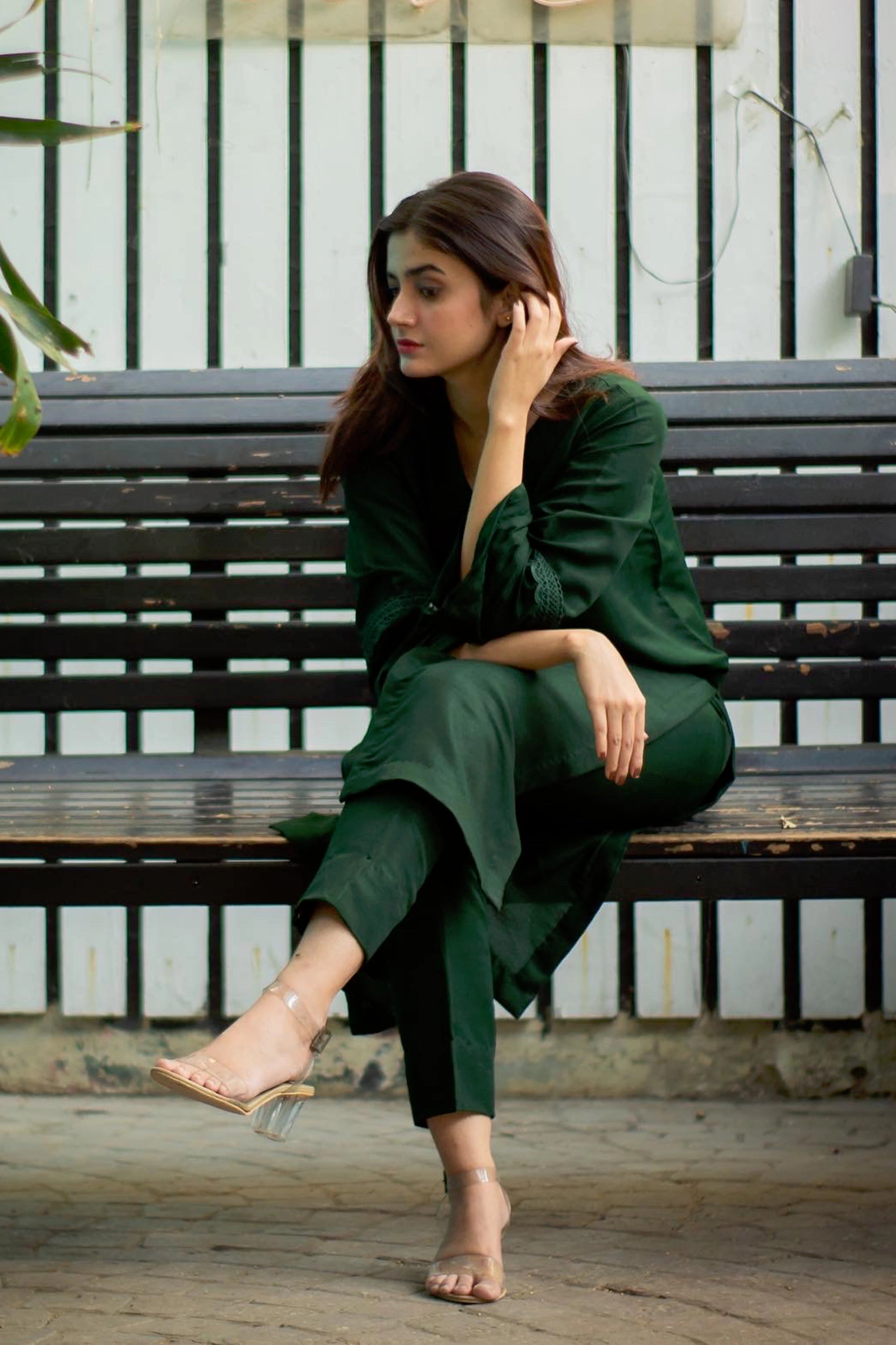 Bottle green two piece with a front open shirt with pleated and lace details on sleeves with matching pants