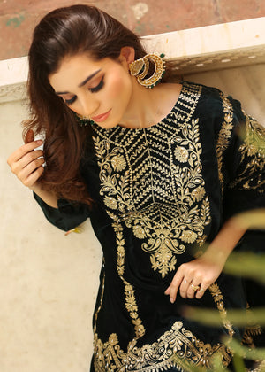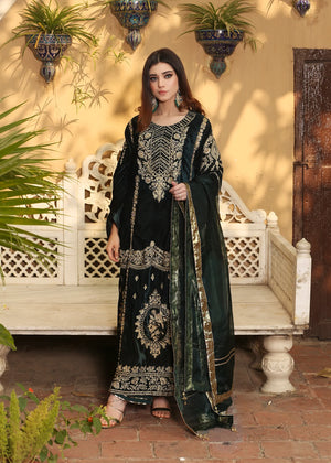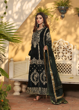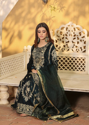 This velvetty bottle green colour is beautiful made with kali dar kurta full of ari tilla work over it with an organza gotta pati dupatta. Perfect for the winter foggy days and nights. Please Note: This outfit length is 50 inches.