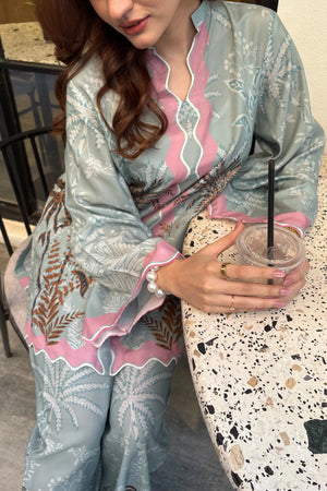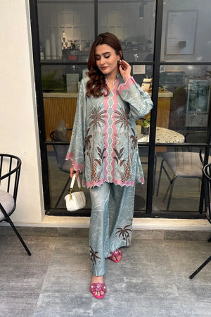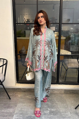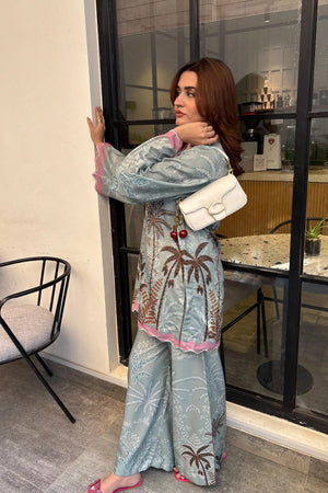 A refreshing blue 2-piece in premium Poly Lawn featuring tropical palm motifs and pastel accents.