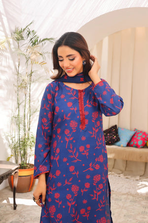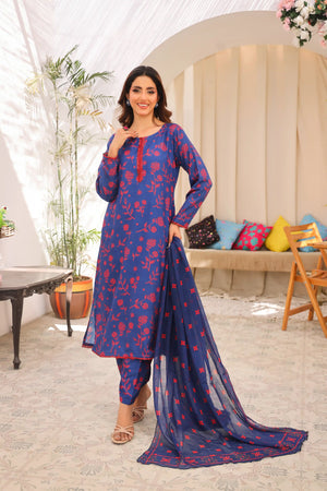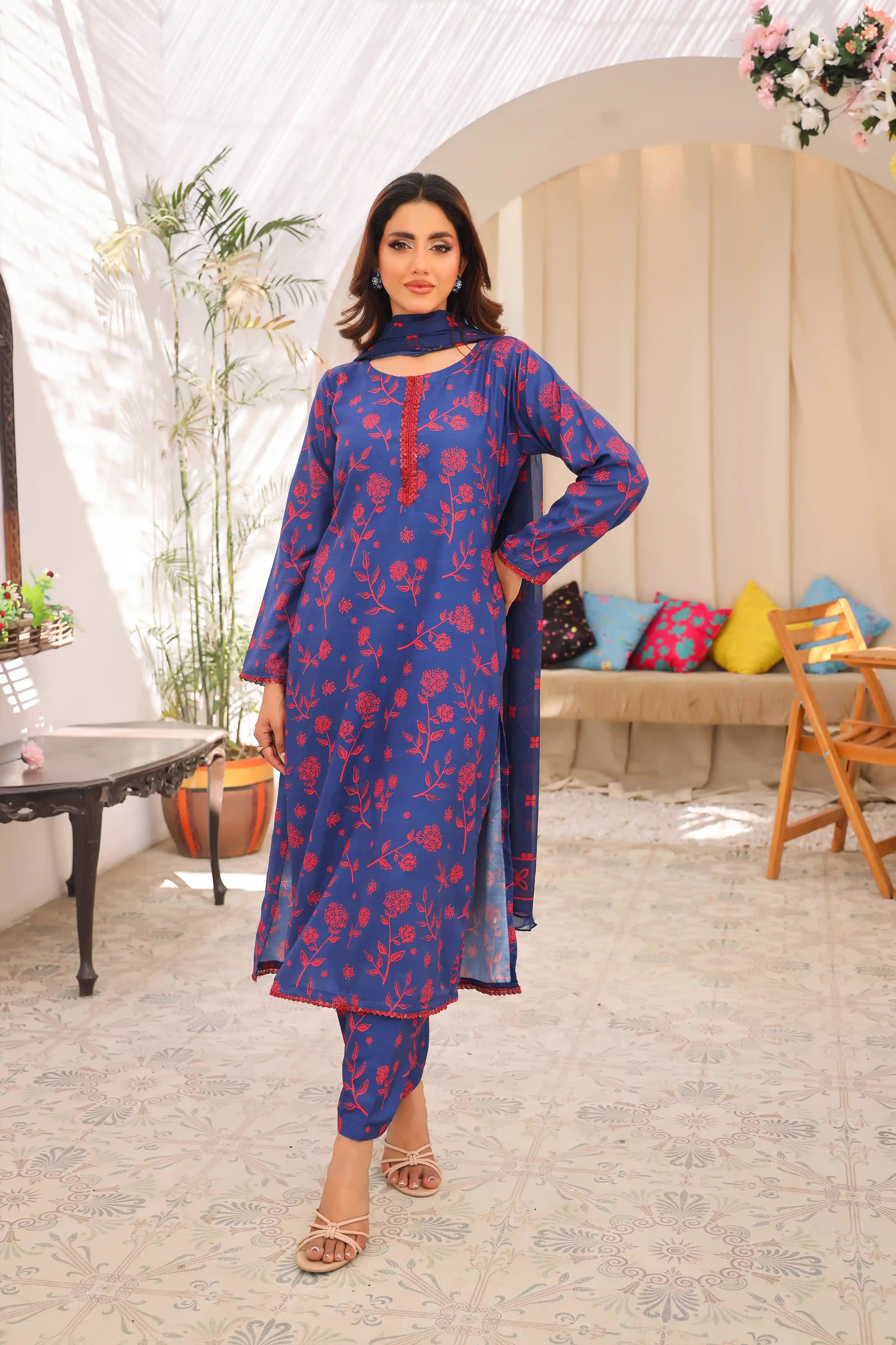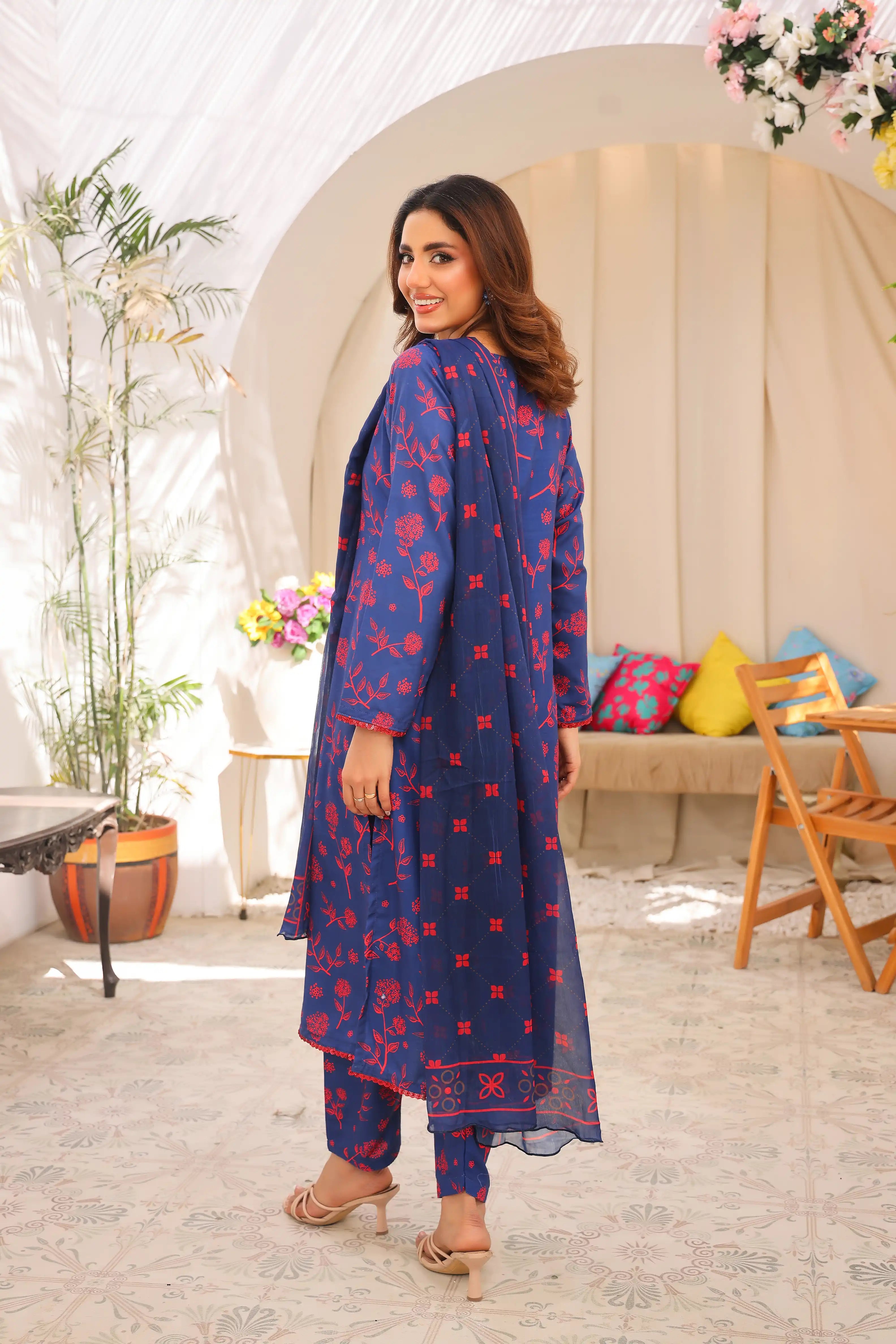 Step into Brief Horizon Swiss Lawn with a blue base and pink floral print, and a soft chiffon dupatta with flowers. Perfect for a fresh and lively look!