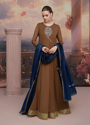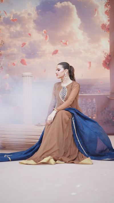 Brown Aura is a graceful formal outfit designed to make a subtle yet striking statement. Featuring delicate handwork on a flowy Chiffon shirt, the flared silhouette creates a beautifully elegant and feminine look.