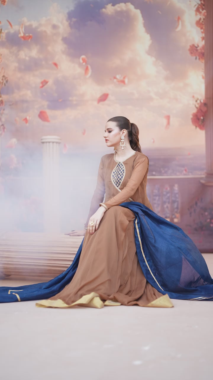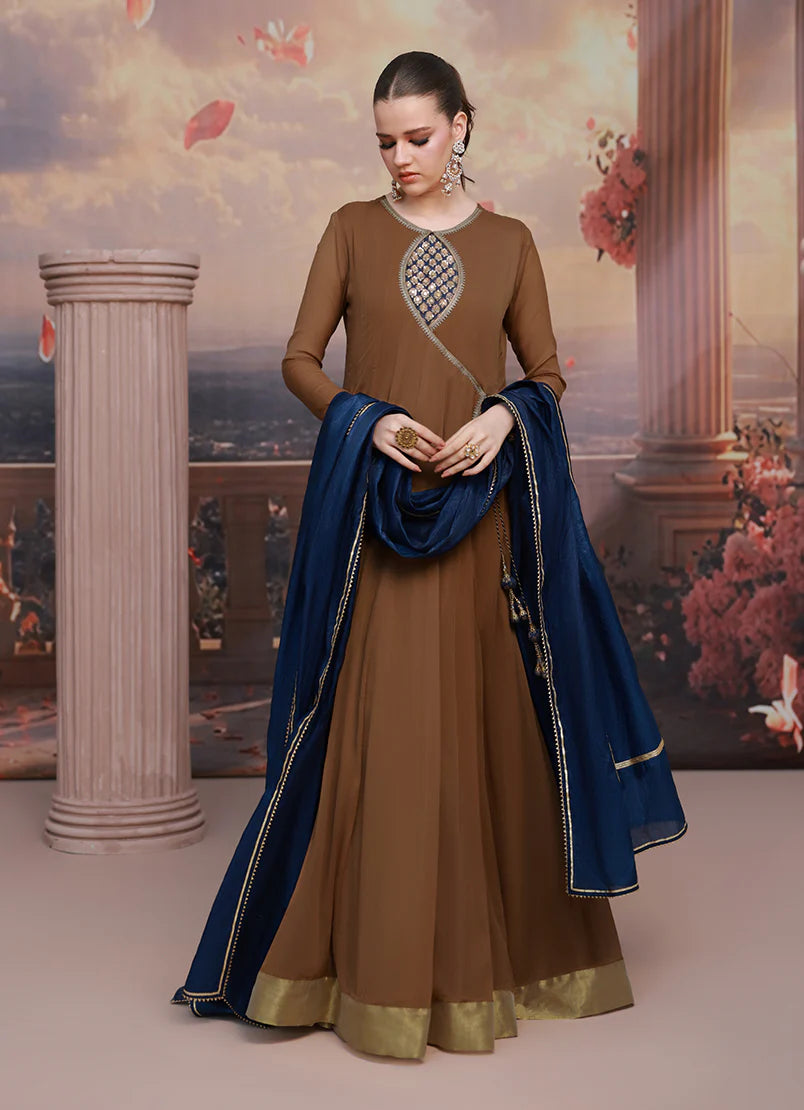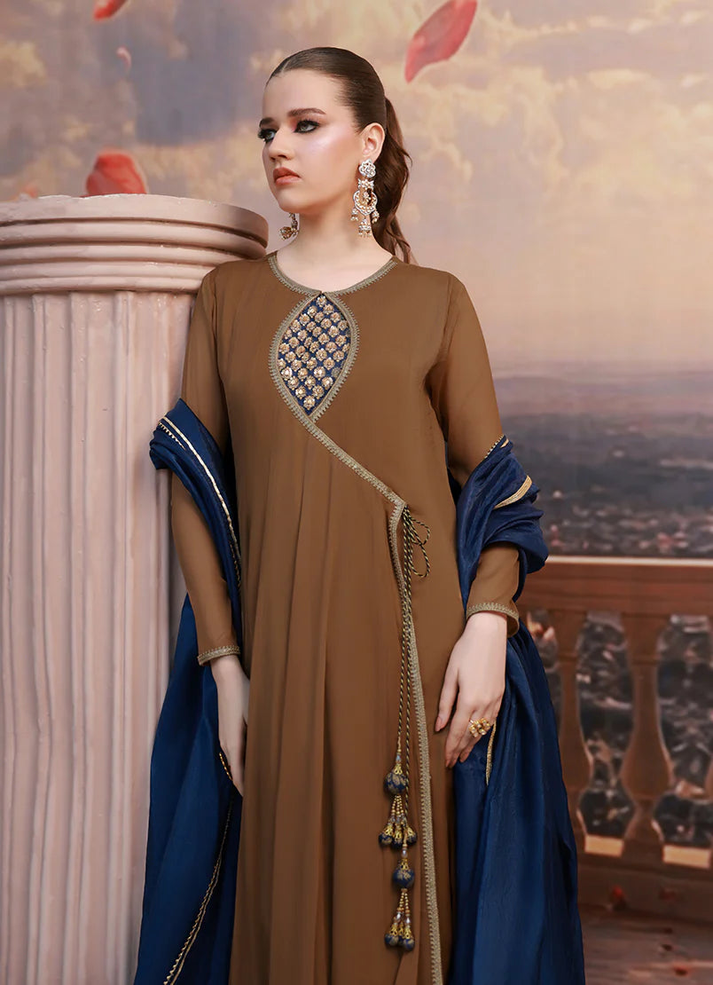 Paired with a lightweight Organza dupatta, this two-piece ensemble offers effortless movement and refined charm. The rich brown tone adds depth and sophistication, making it a perfect choice for formal occasions, evening gatherings, and festive wear.