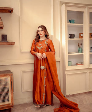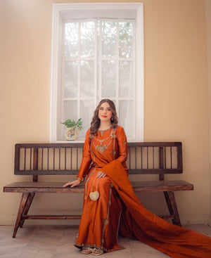 As spring blooms, so does the beauty of Camila. This rust-hued ensemble features tissue silk fabrics, hand-embellished with intricate embroidery and sequin beads, paired with an Organza dupatta. Perfect for spring festivities and Eid celebrations that bring families together!