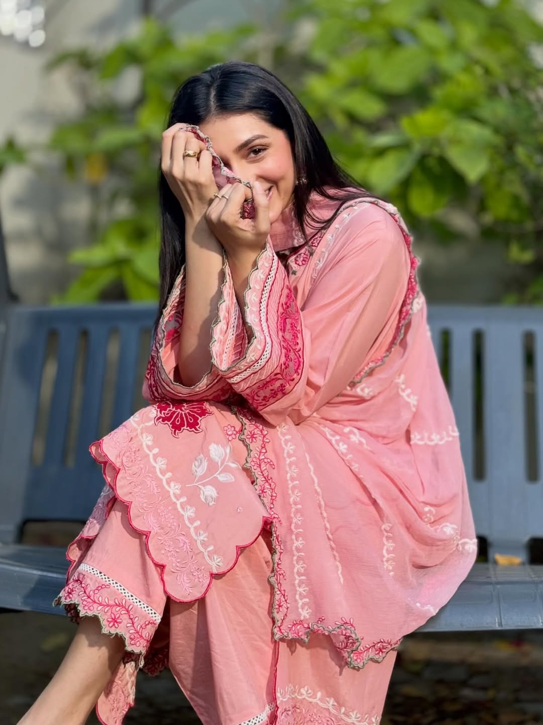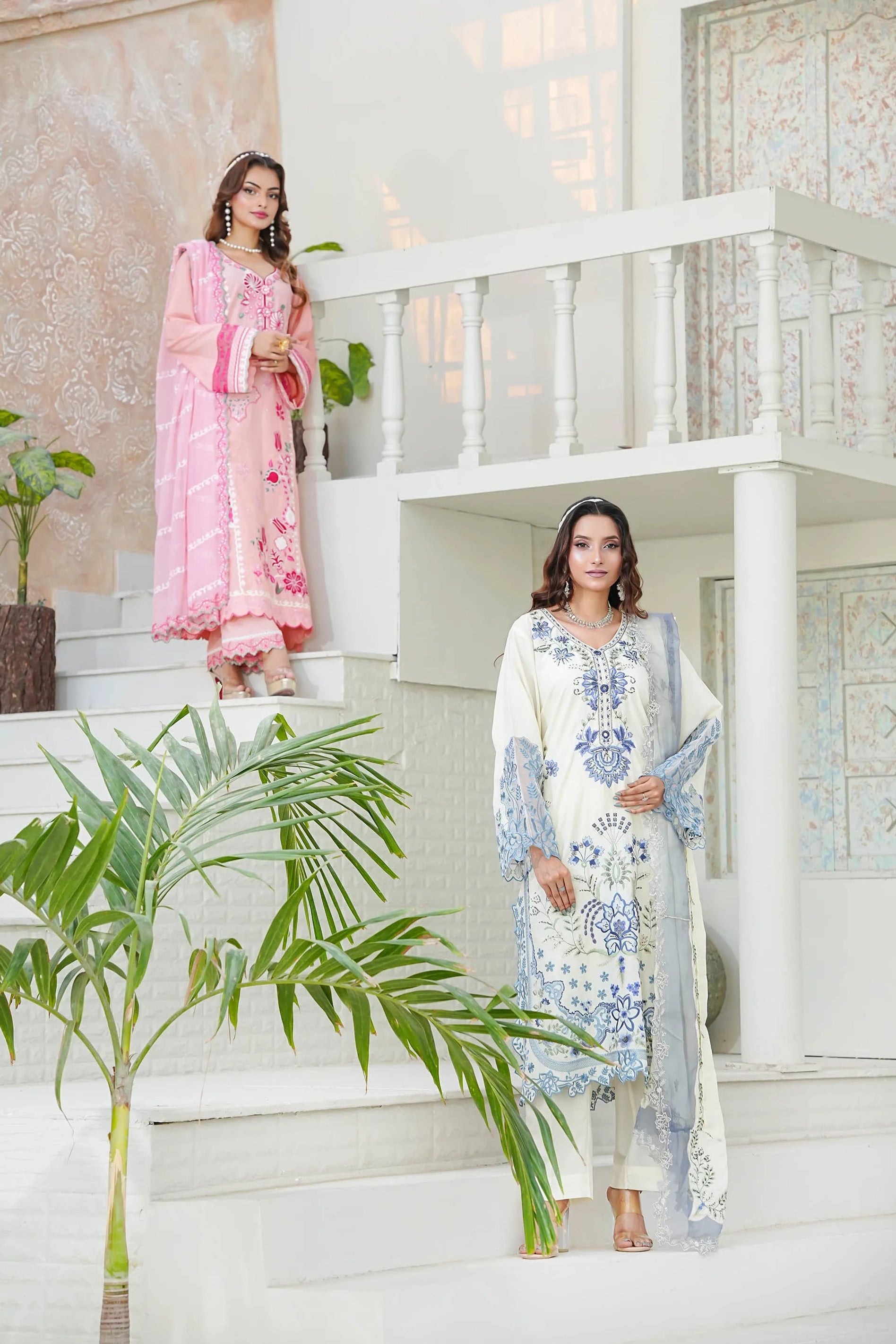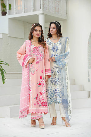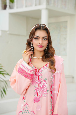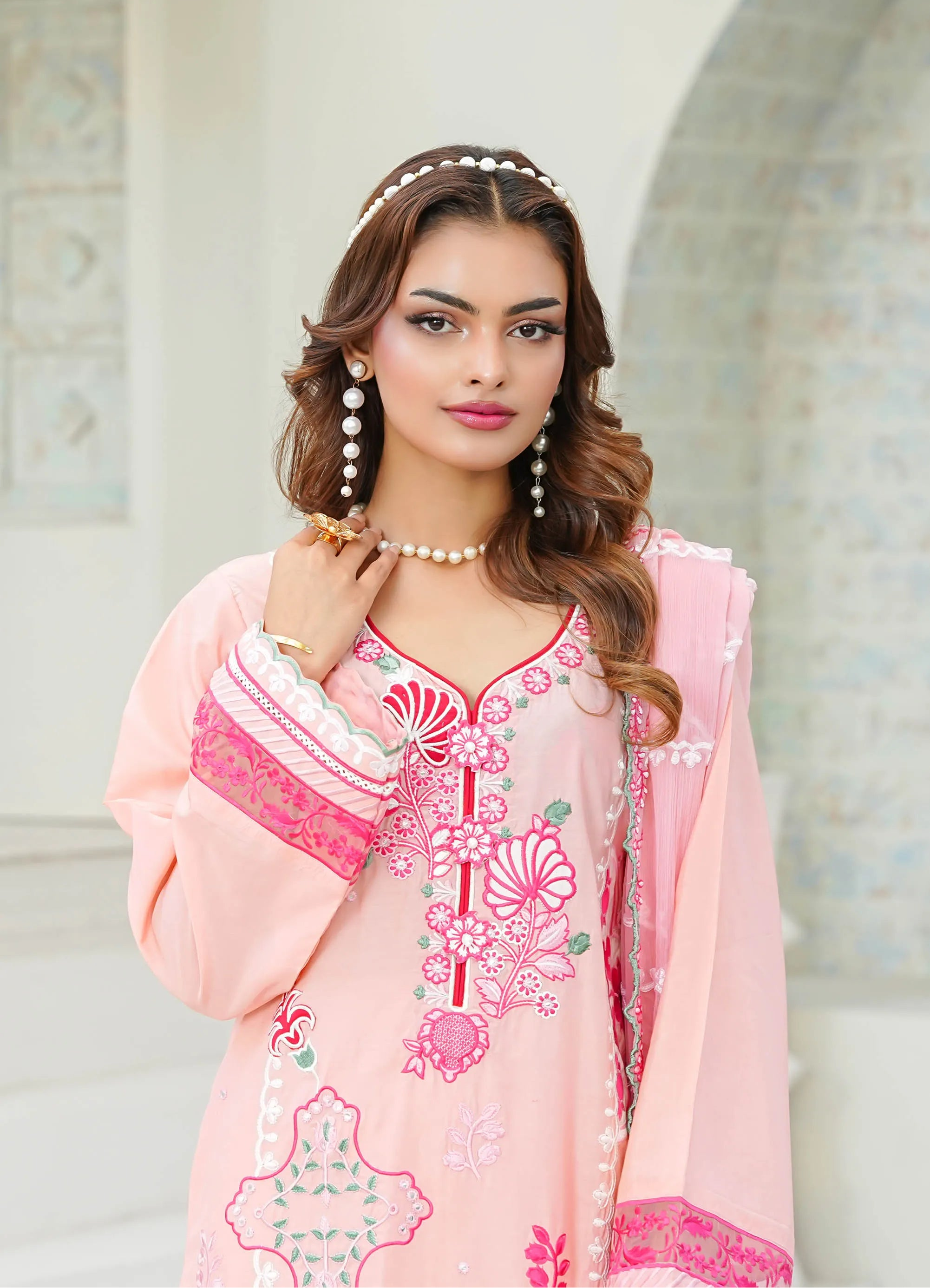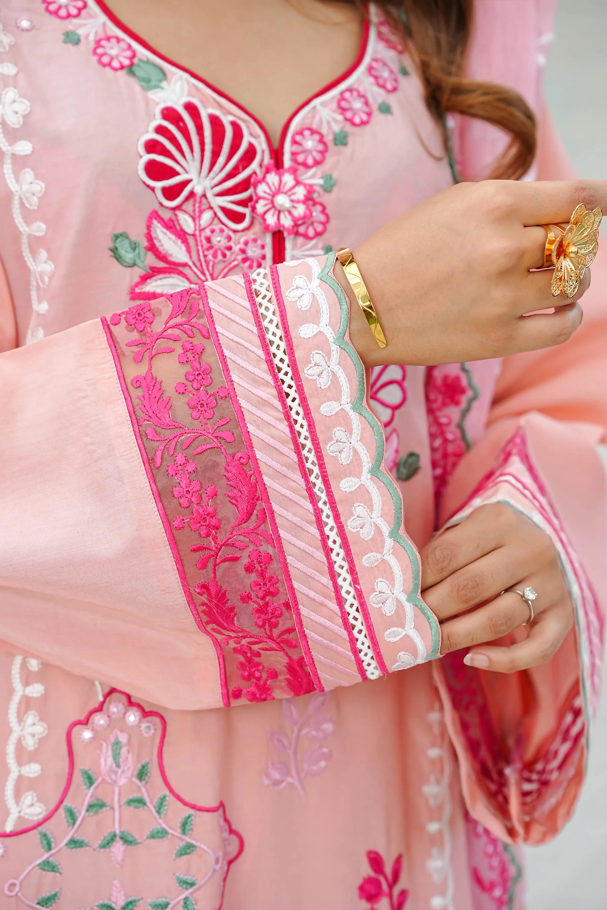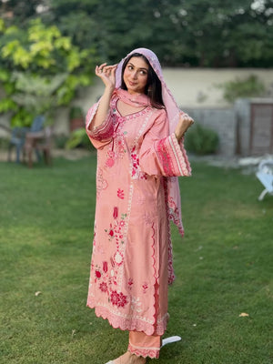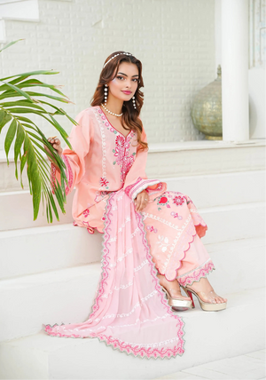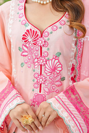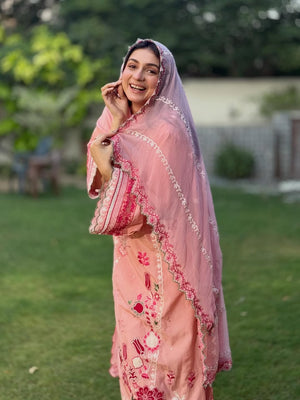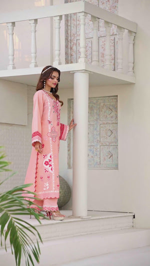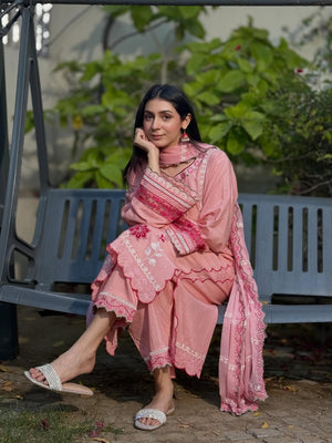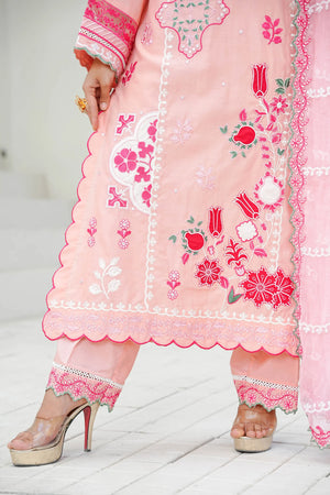 Radiate charm in 'Candy Floss', a delightful pink ensemble featuring intricate floral thread-work embroidery in shades of fuchsia pink and white applique. The look is enhanced with delicate foil work that adds a subtle, festive shimmer to the shirt's front and sleeves. Designed with a stylish scalloped hemline and detailed lace borders, it is paired with a matching pink chiffon embroidered dupatta and straight trousers featuring heavy embroidered borders for a perfectly coordinated finish.