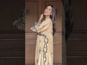 An enchanting two-piece set featuring a luxurious beige shirt adorned with striking black thread embroidery. The intricate floral and geometric patterns create a dramatic contrast, defining the wide neckline, vertical panel, flared border, and embroidered back. Paired with coordinating solid beige capri style trousers, this ensemble embodies sophisticated glamour, perfect for an evening statement.