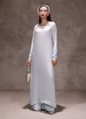 Ethereal in ice blue, this elegant ensemble is crafted from premium tussle silk. The long A line shirt pairs seamlessly with culottes, creating a graceful silhouette. Delicate pearl handwork on the shoulder bow & all over organza dupatta gives this timeless three piece set exuding sophistication and charm.