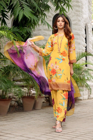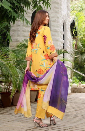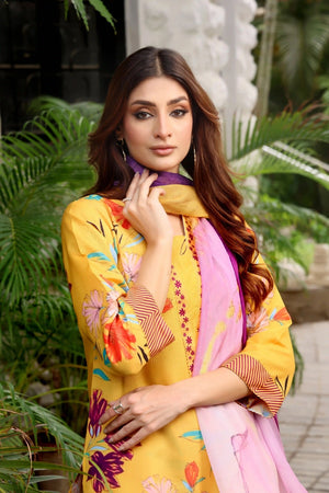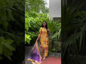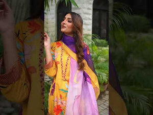 Adorn Chatoyant: Swiss Lawn with a yellow base, overall floral print, printed shirt border, and a soft silk dupatta with a purple base and floral prints. Perfect for a radiant and cheerful look!