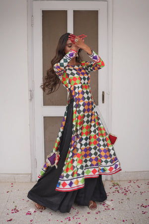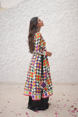 This outfit features a vibrant A-line kali-style frock crafted from luxurious Florence silk, detailed with a boat neckline and side dori and tassel accents. Paired with a short, pleated silk palazzo, it exudes elegance and comfort. A soft chiffon silk dupatta with a matching geometric pattern completes the look.