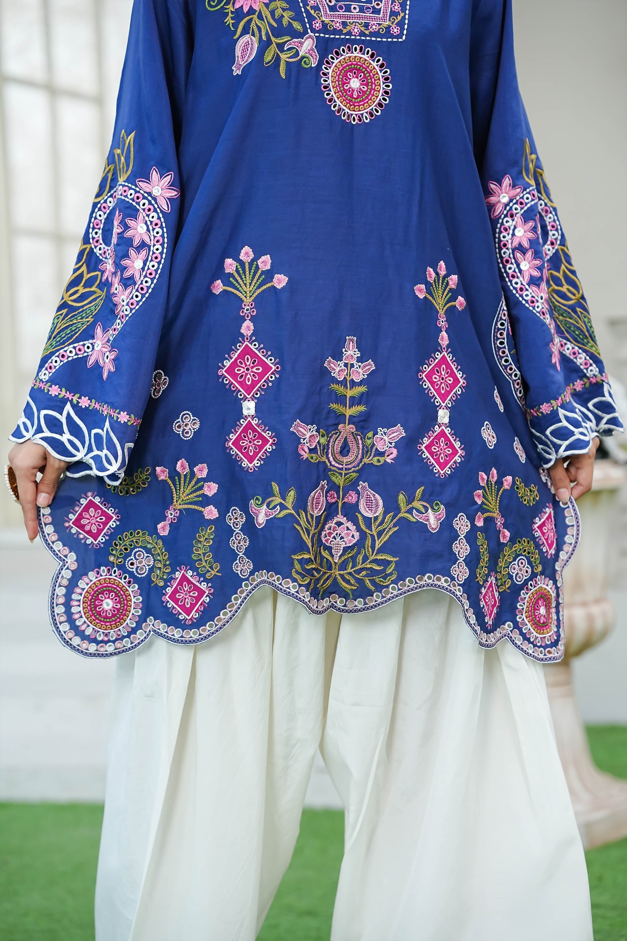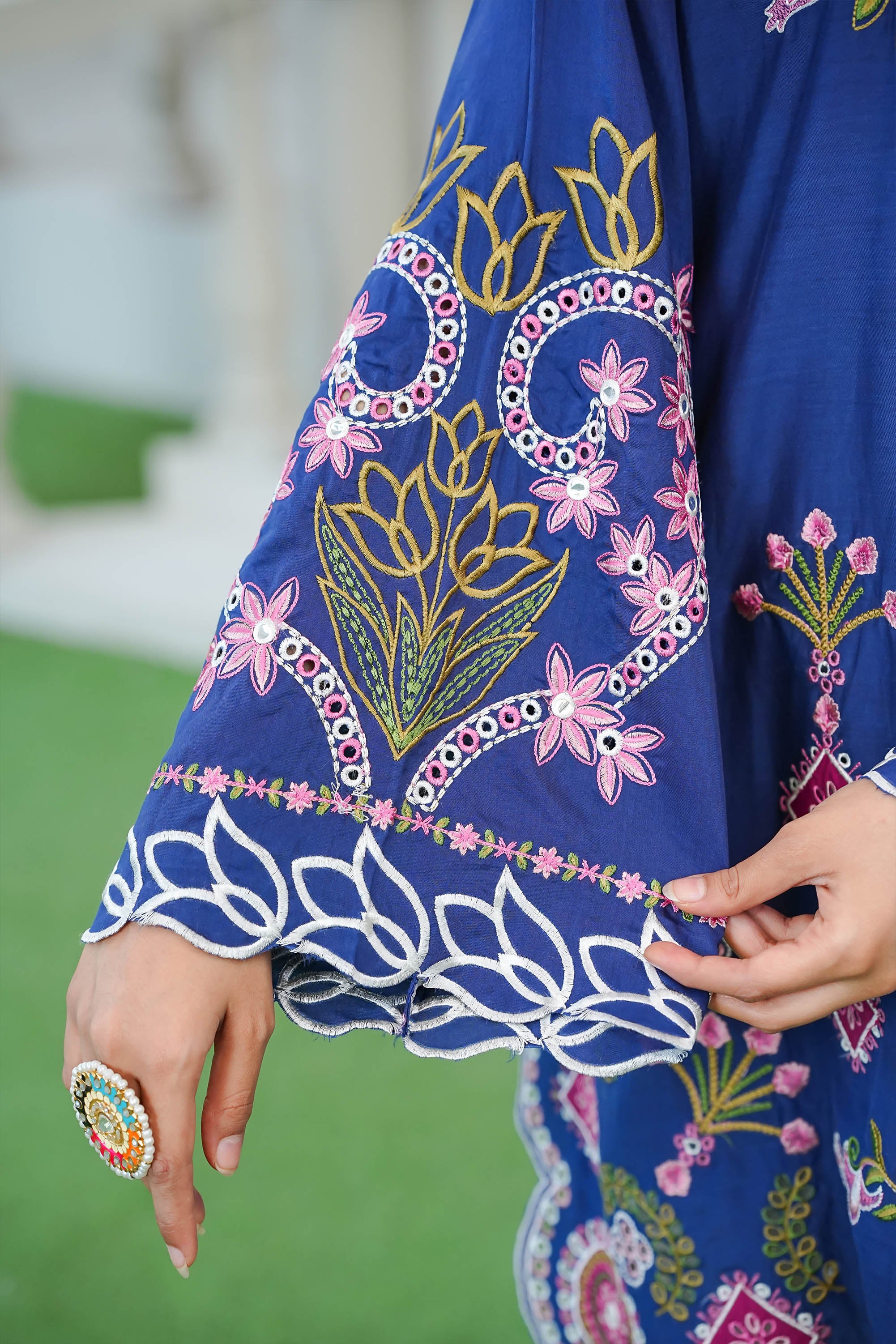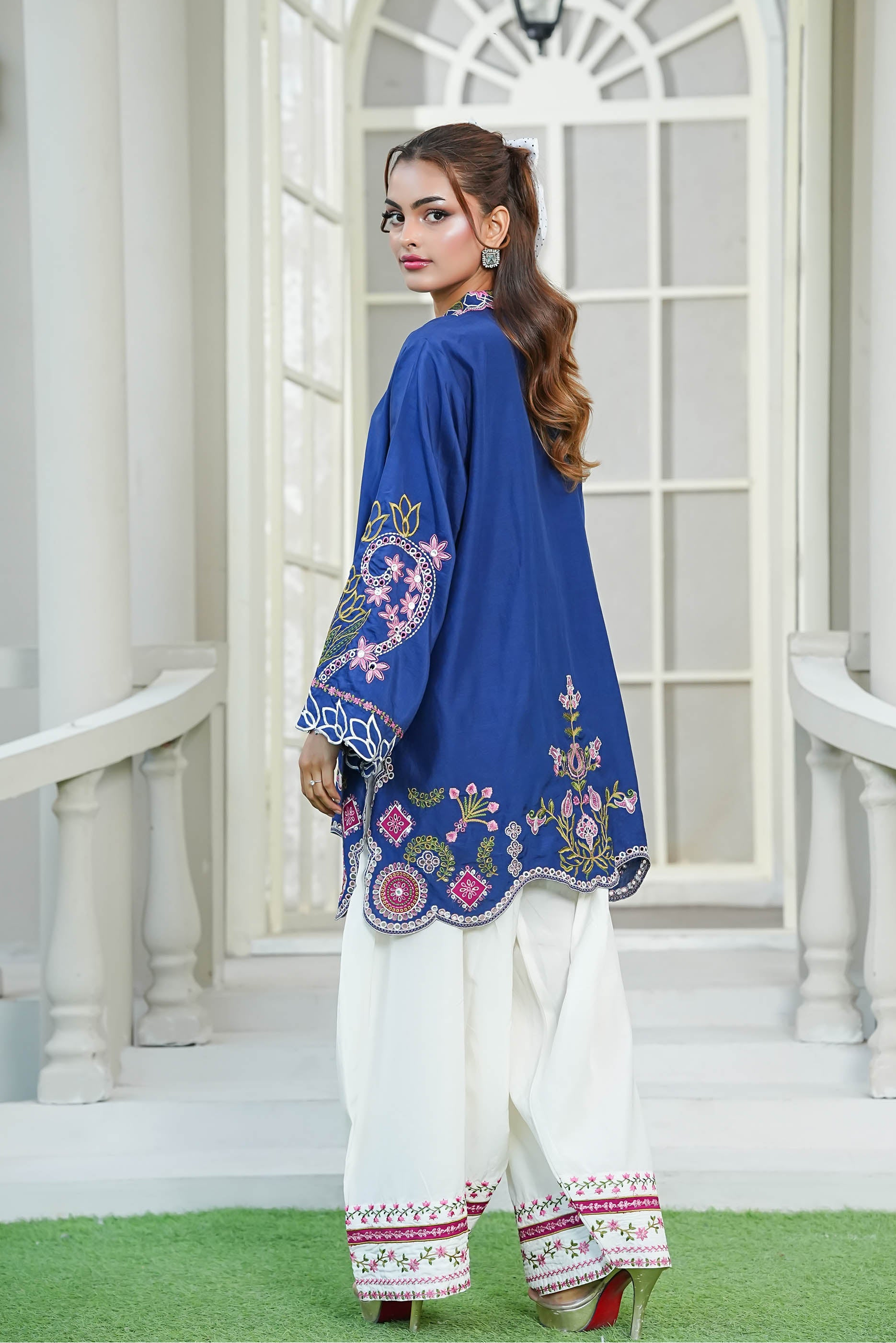 Make a bold statement with ‘Cobalt Charm,’ a deep royal blue ensemble featuring a masterful blend of vibrant thread-work embroidery and premium appliqué details. The shirt is designed with a beautiful embroidered collar, a modern scalloped hem, and wide statement sleeves, paired with an off-white farshi-style shalwar that offers a voluminous gher and intricate embroidered borders. Combining a high-contrast color palette with a classic flared silhouette, this look is the perfect fusion of heritage and style for your Eid festivities.