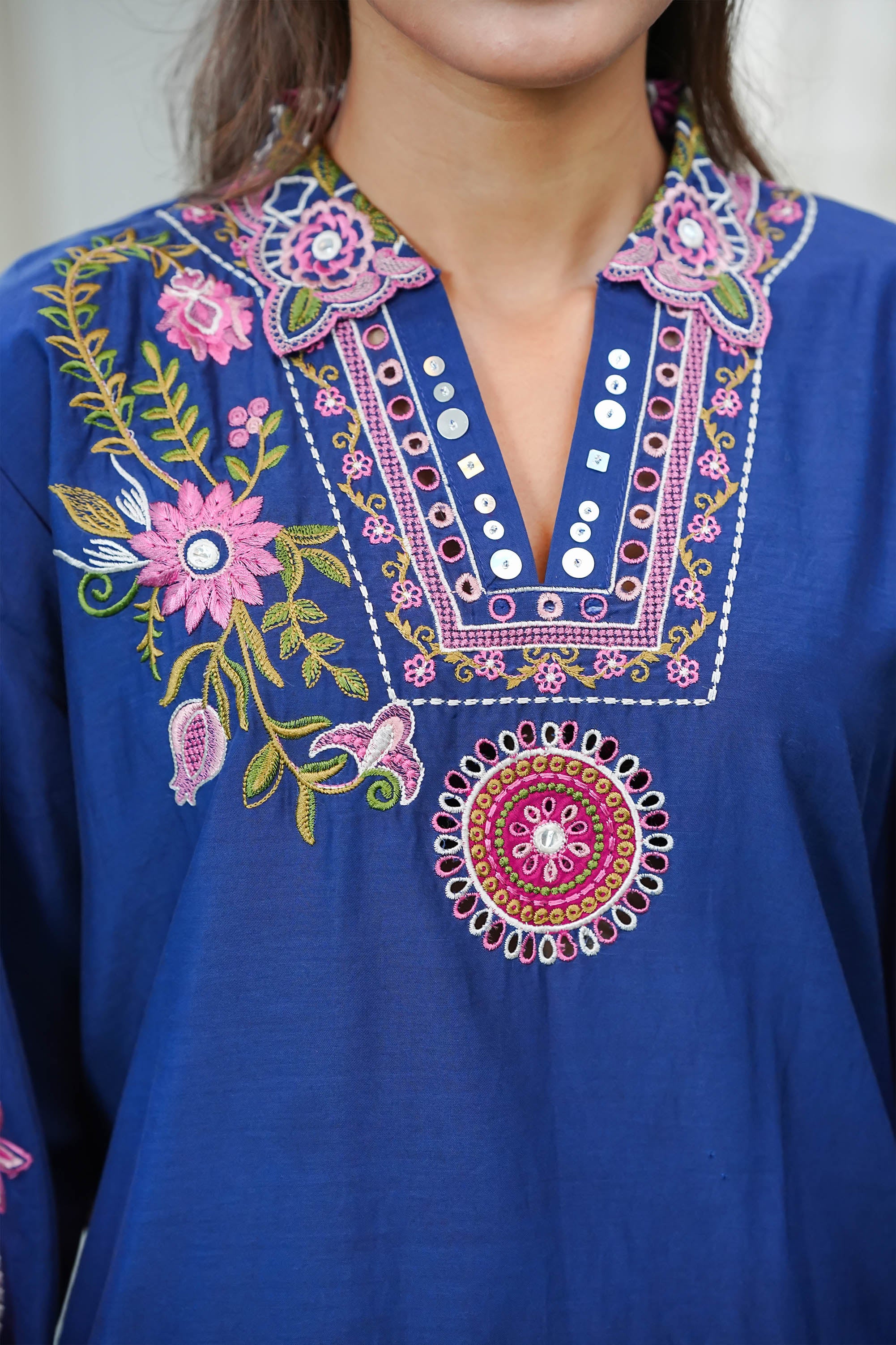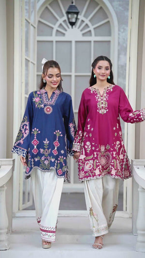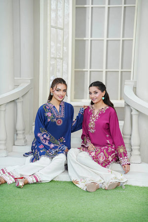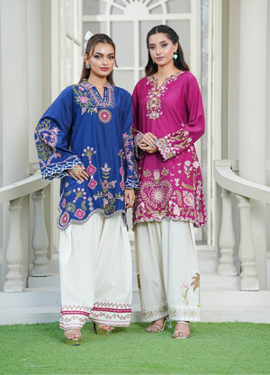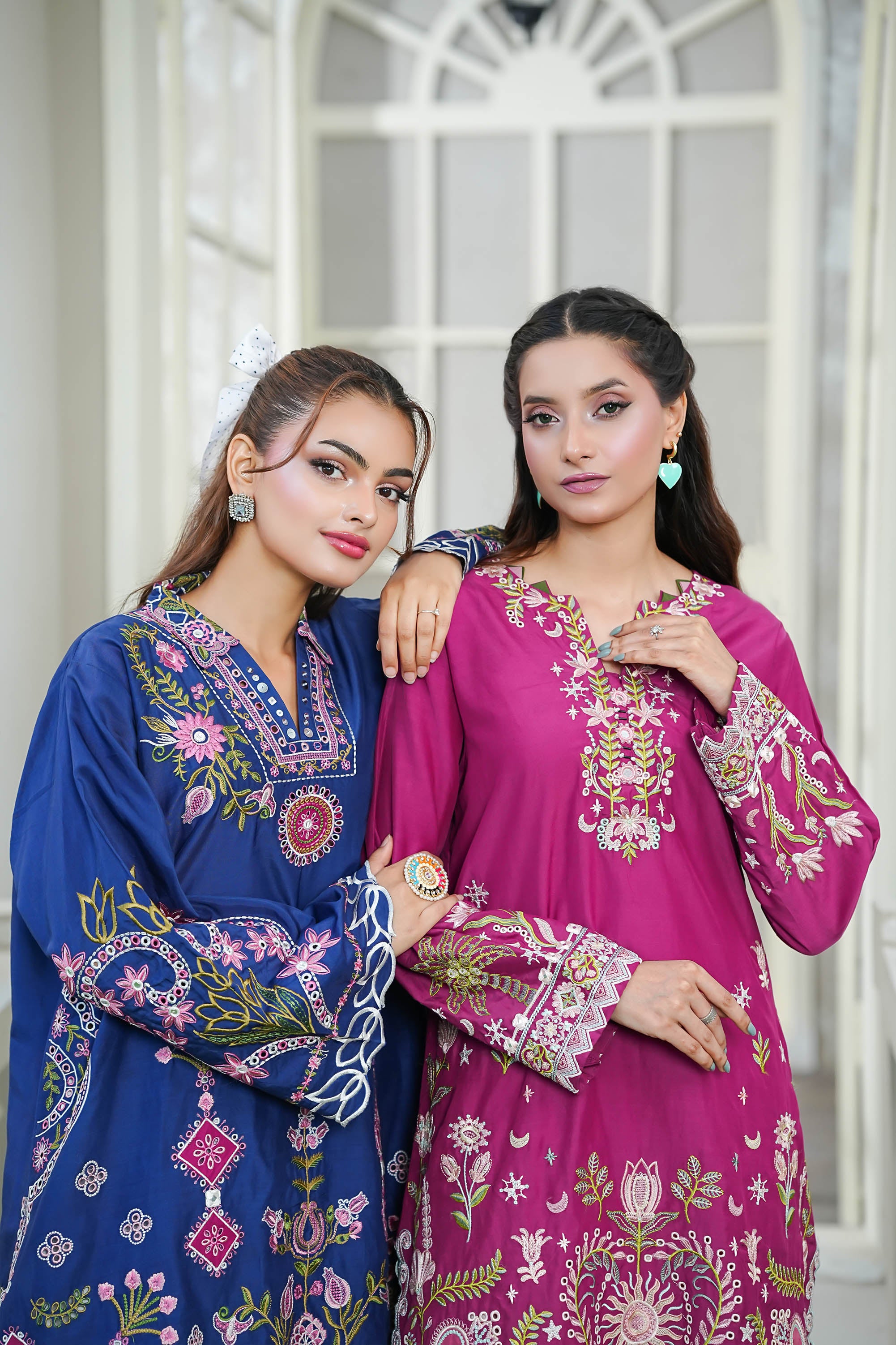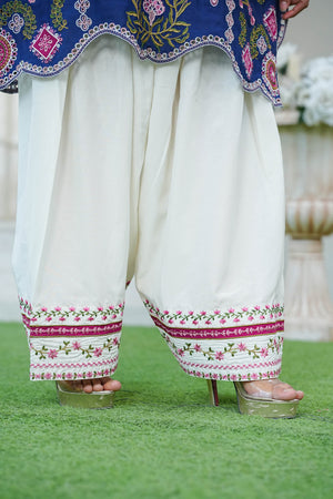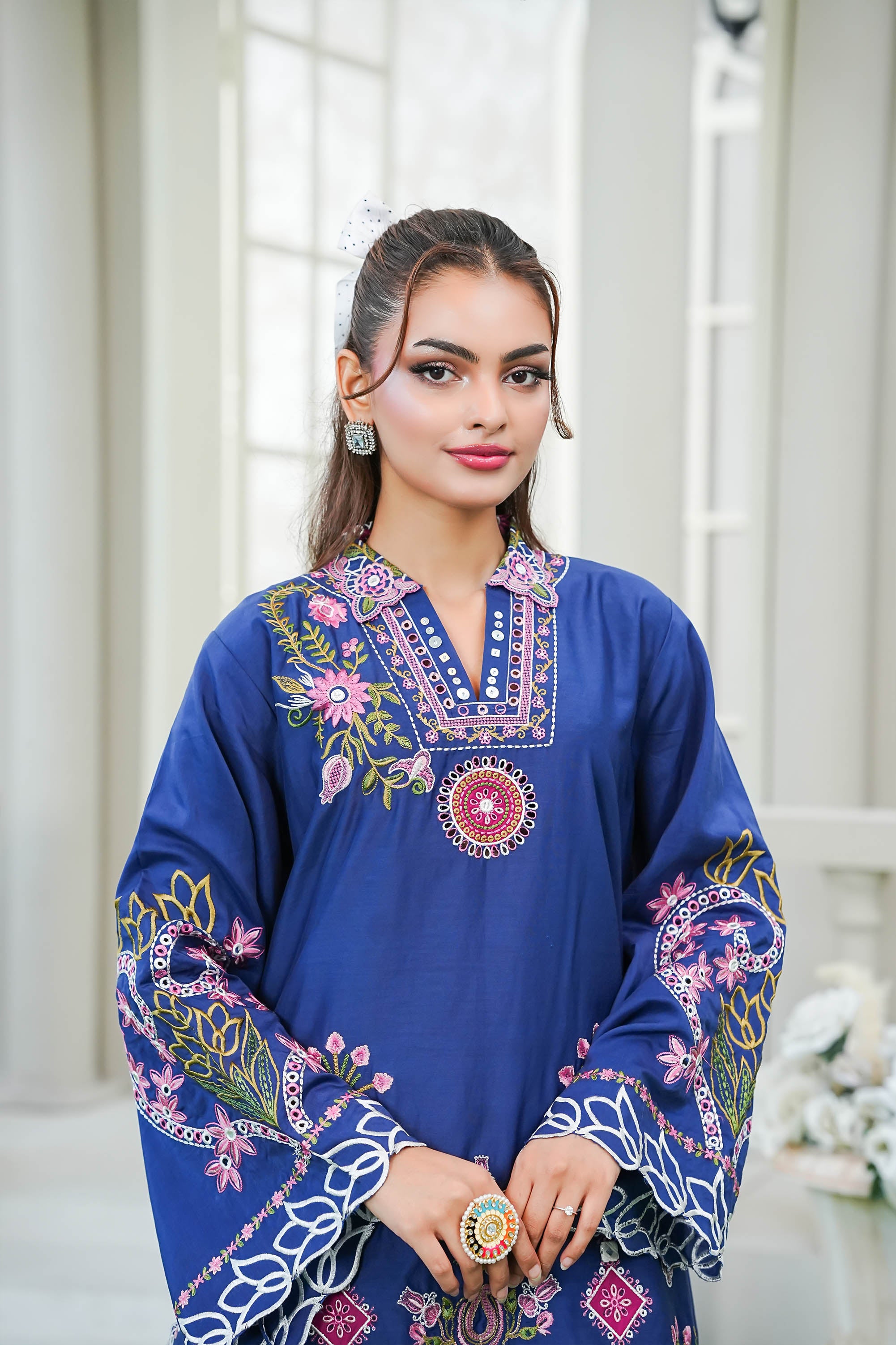 Make a bold statement with ‘Cobalt Charm,’ a deep royal blue ensemble featuring a masterful blend of vibrant thread-work embroidery and premium appliqué details. The shirt is designed with a beautiful embroidered collar, a modern scalloped hem, and wide statement sleeves, paired with an off-white farshi-style shalwar that offers a voluminous gher and intricate embroidered borders. Combining a high-contrast color palette with a classic flared silhouette, this look is the perfect fusion of heritage and style for your Eid festivities.