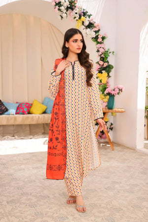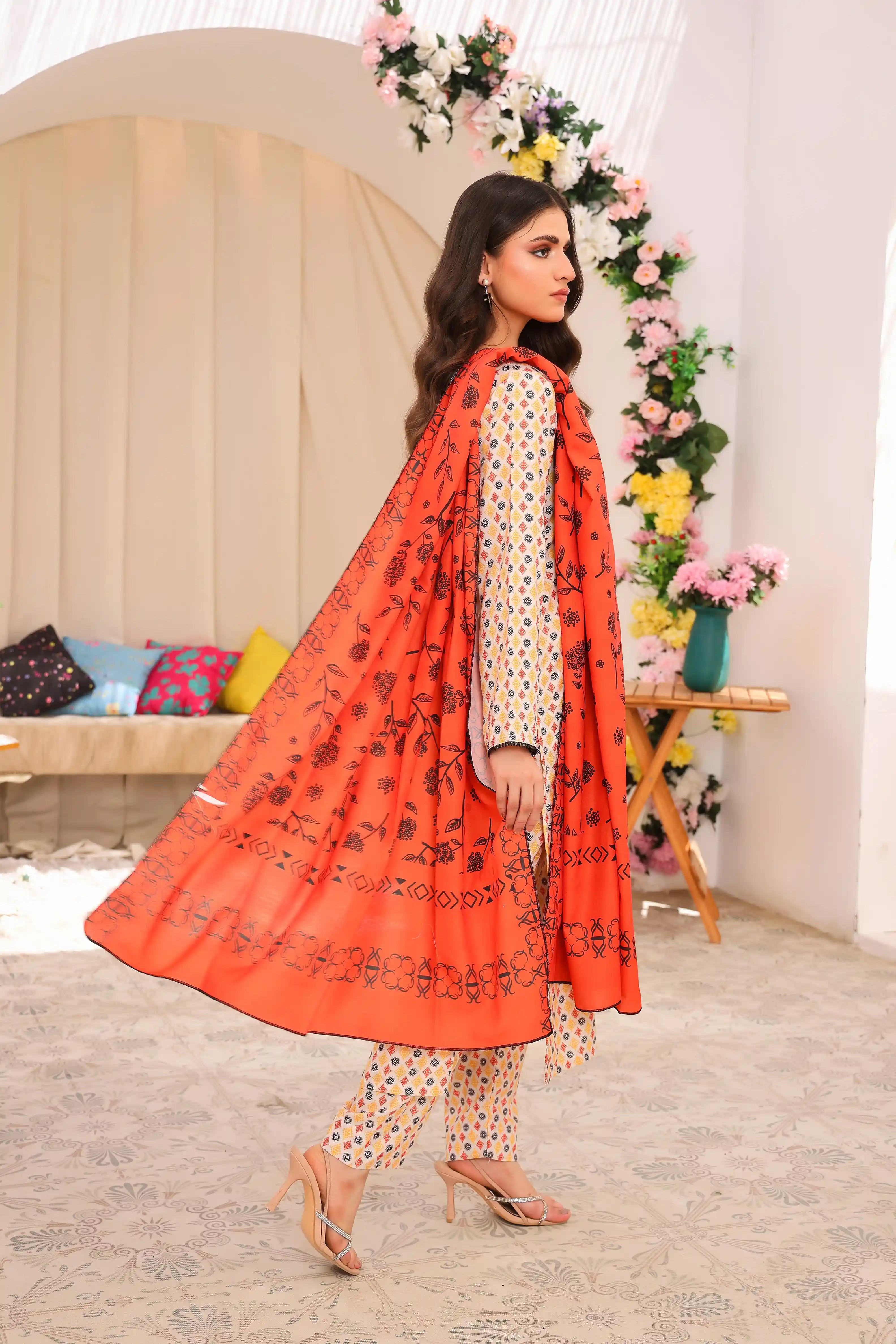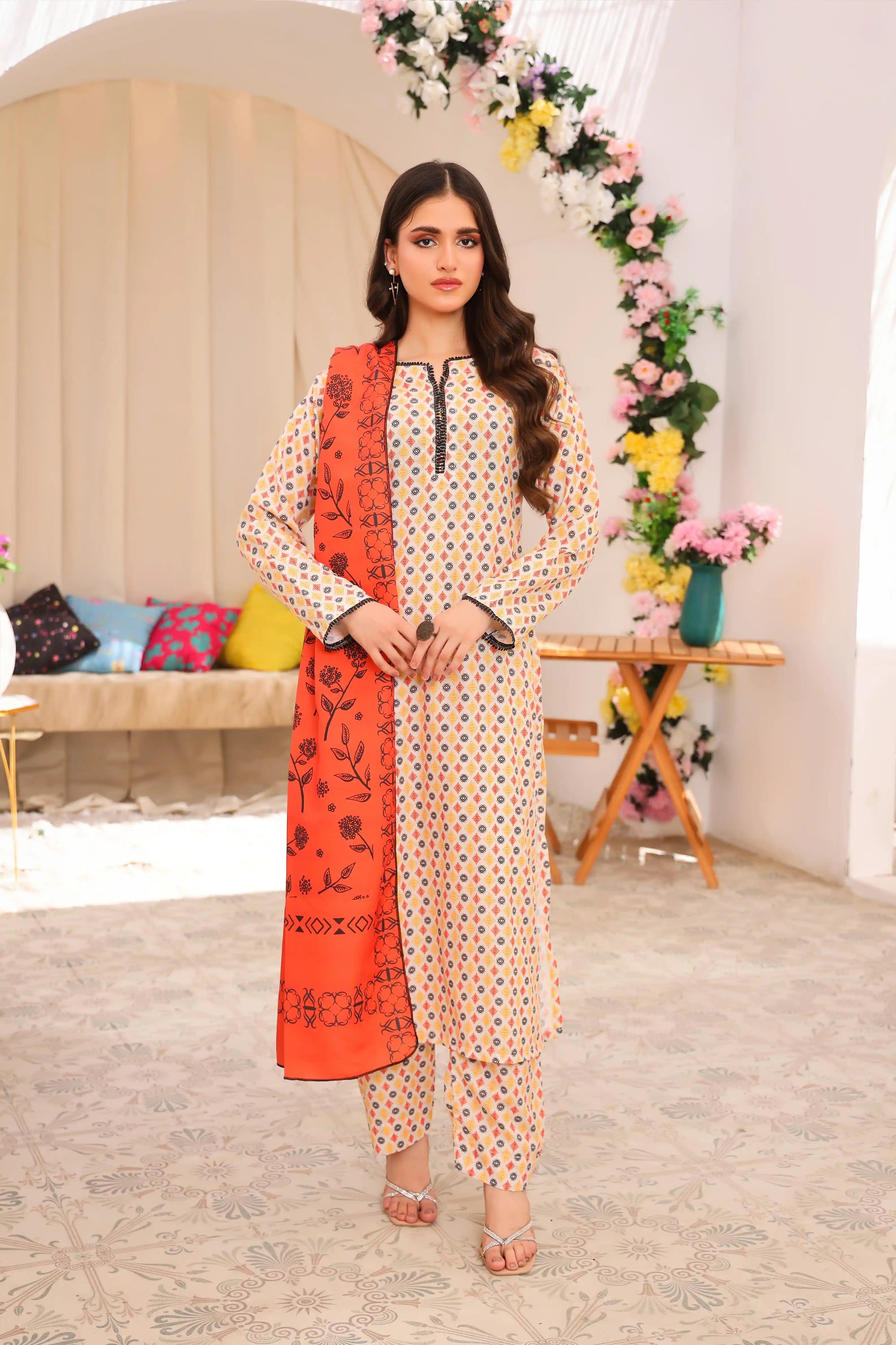 Presenting Color Petal – an exquisite Swiss Lawn ensemble with a soft beige base, beautifully embellished with an all-over floral print. Complemented by a striking Orange floral lawn dupatta, this outfit embodies effortless elegance and timeless charm.