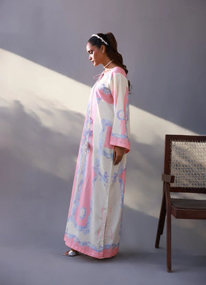 Cotton Candy & Macaroons kaftan is a dreamy pastel delight with soft ivory as the base, sprinkled with baby blue and pink hues for a super girly vibe. The neckline is detailed with a sweet bow and pearl tassel dori, adding a playful, charming touch. Made in breathable crepe, it’s perfect for walking through your day in comfort and style.