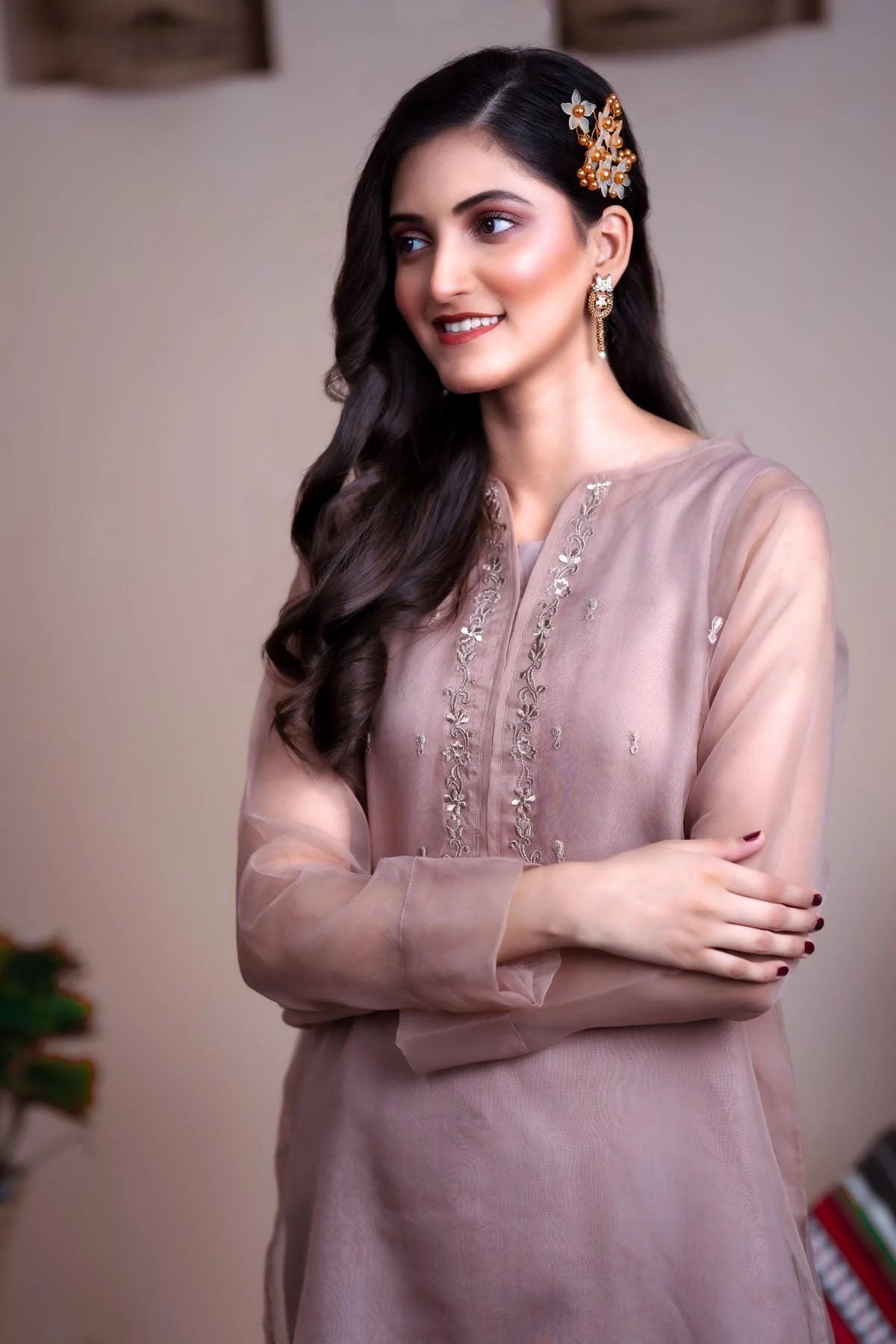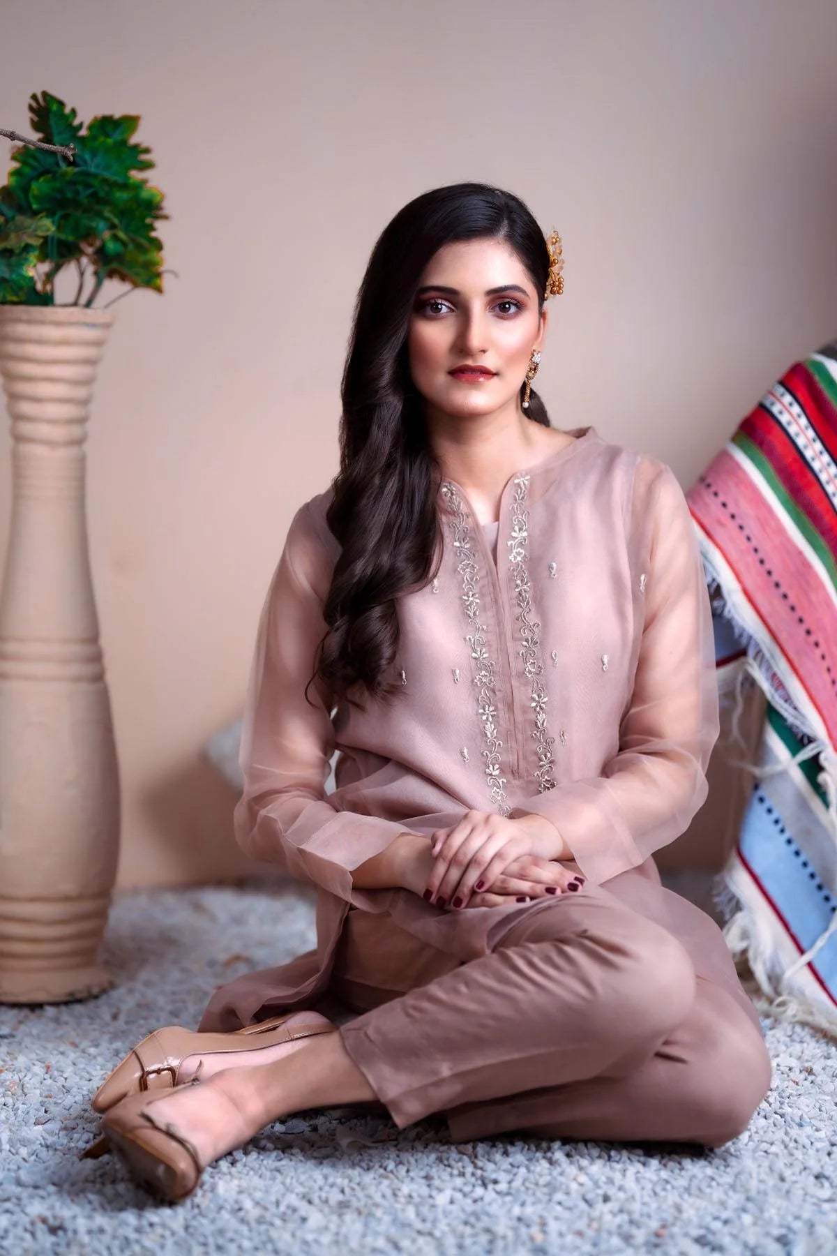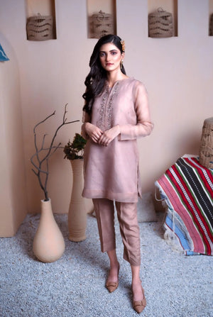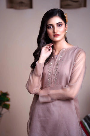 Upgrade your style statement with our latest rose gold addition to the family. The delicacy in this design will uplift your outlook and bring out the inner diva in you. We chose this shade of rose beige to make you a stunner wherever you go. Tilla embroidery is finely done on the neckline for bringing the colour out even more. This dress is an ideal companion for evening wear or just when you are looking to glamorise your look.