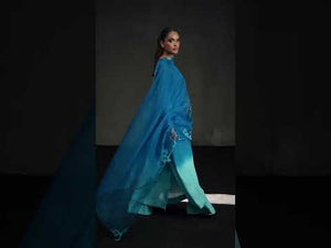 The Aqua Mirage Set captivates in a striking blue ombre palette, offering a unique blend of blue hues. The shirt features hand embroidered sleeves with delicate gota and stone work, paired with sleek culottes for a refined finish. Cutwork embroidered organza dupatta, sold separately, completes the look making this set all about the chic cut, modern hues, and elevated handwork.