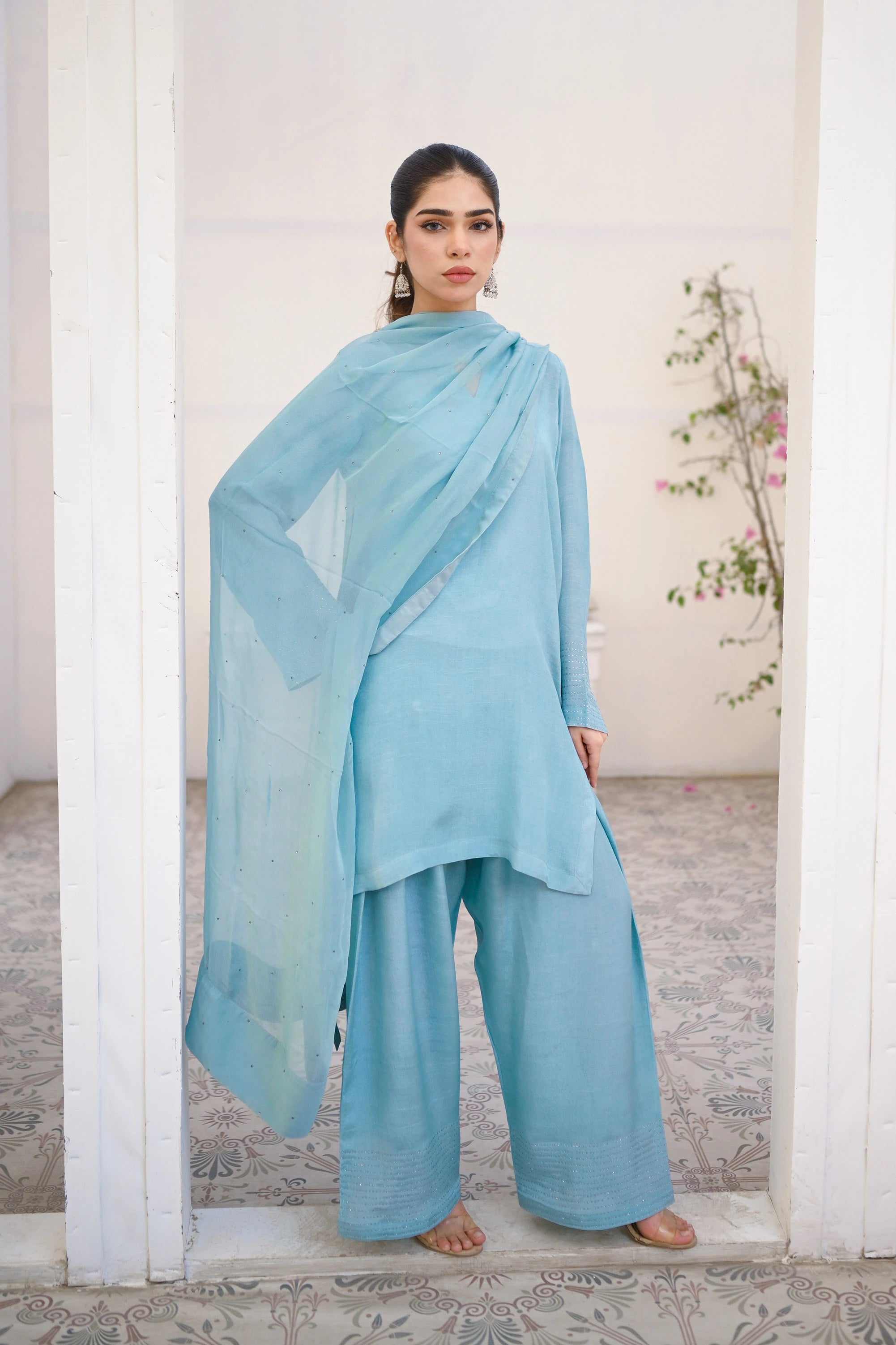 It’s a three piece dress includes a shirt and farshi shalwar along with chiffon dupatta. Embellished with stone details on sleeves, shalwar and dupatta.