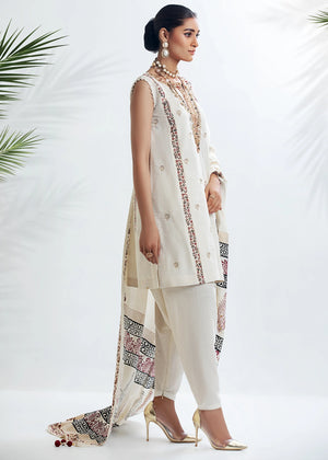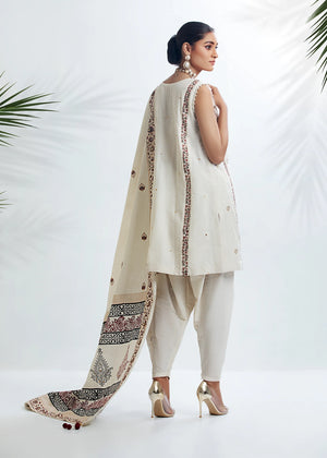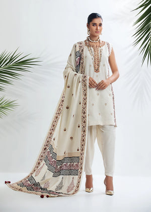 Off white karandi lawn pure fabric with block print and gold ari work touch up of sitaraa gives a perfect piece of art. Duppatta is fully block printed cotton lawn with sequence hand work. This article comes with shirt only and rest can be added on. Shirt length is 38.