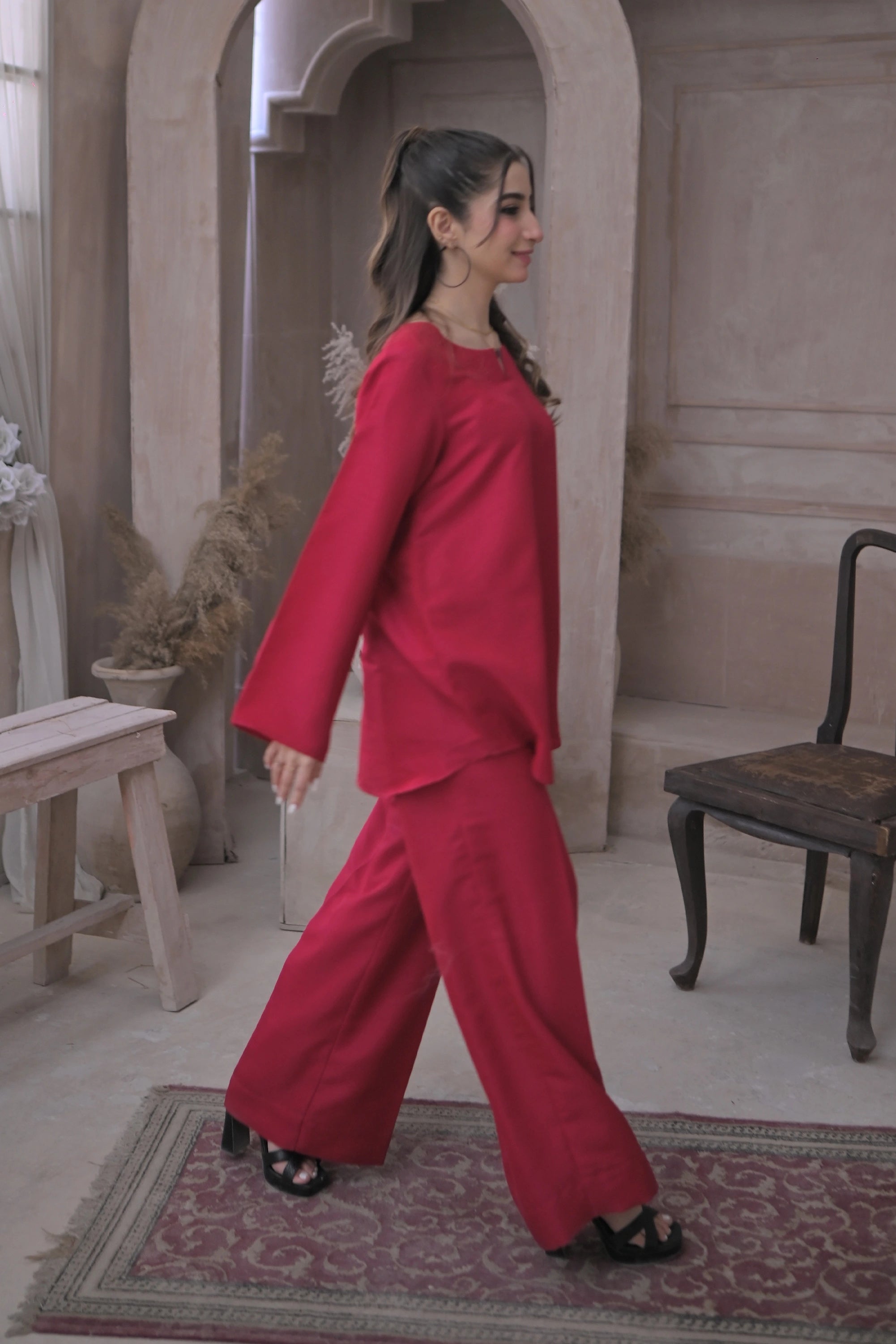 Deep pink matching set includes a short shirt along with the long culotte.